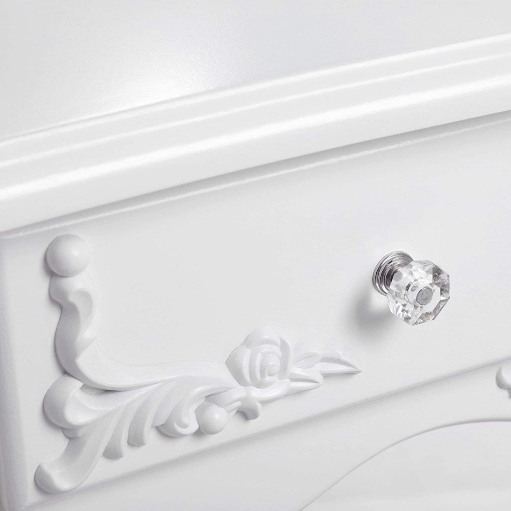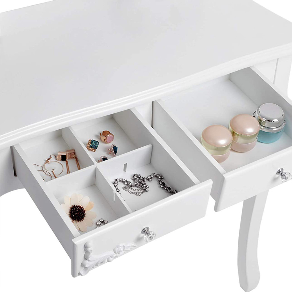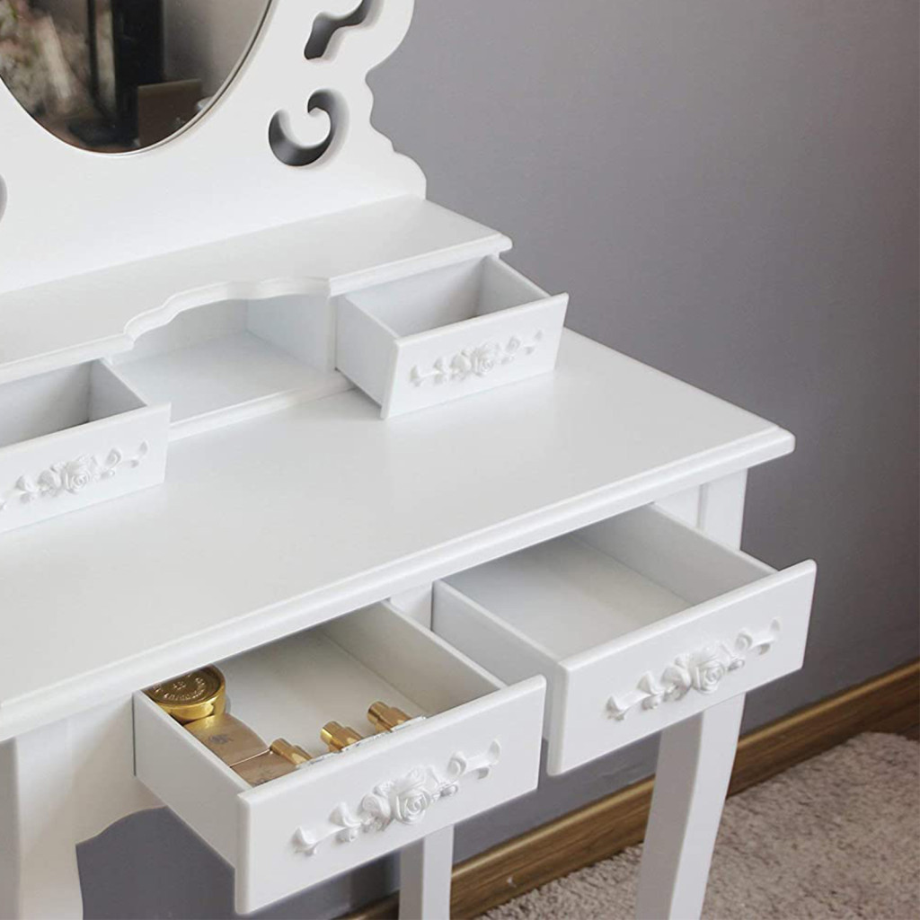 Ez a gyönyörű, hercegnői stílusú fésülködőasztal szett tökéletes kombinációja az elegáns dizájnnak és a praktikus funkcionalitásnak. A fehér, faragott díszítésekkel ellátott bútor 4 fiókkal rendelkezik, amelyek bőséges tárolóhelyet biztosítanak kozmetikumainak és kiegészítőinek.