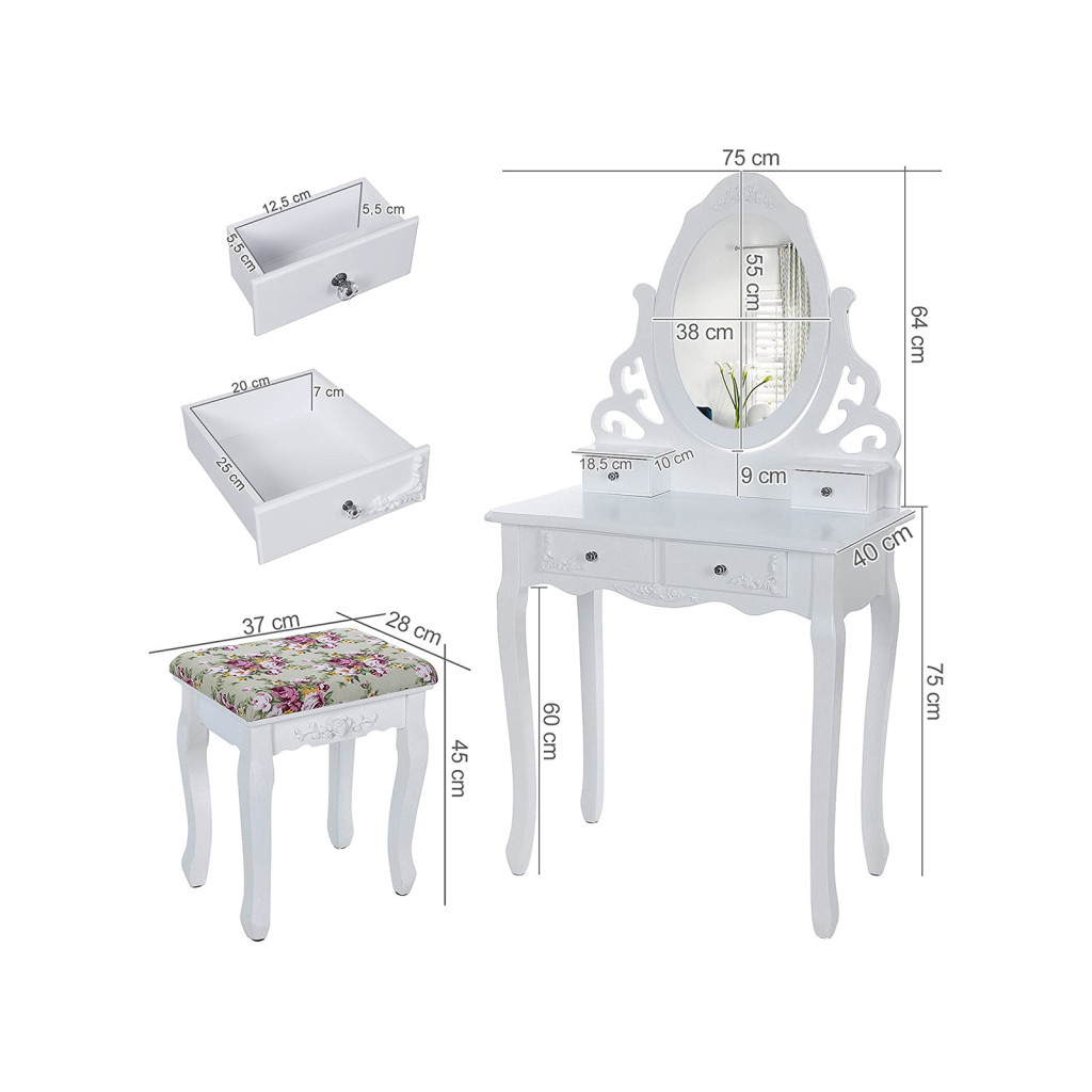 A 360 fokban forgatható ovális tükör és a virágmintás kárpitozású ülőke kényelmes környezetet teremt a mindennapi szépségápolási rutinhoz. Az E1 minőségű MDF anyagból készült asztal stabil és tartós, míg a gumifa lábak extra stabilitást biztosítanak.