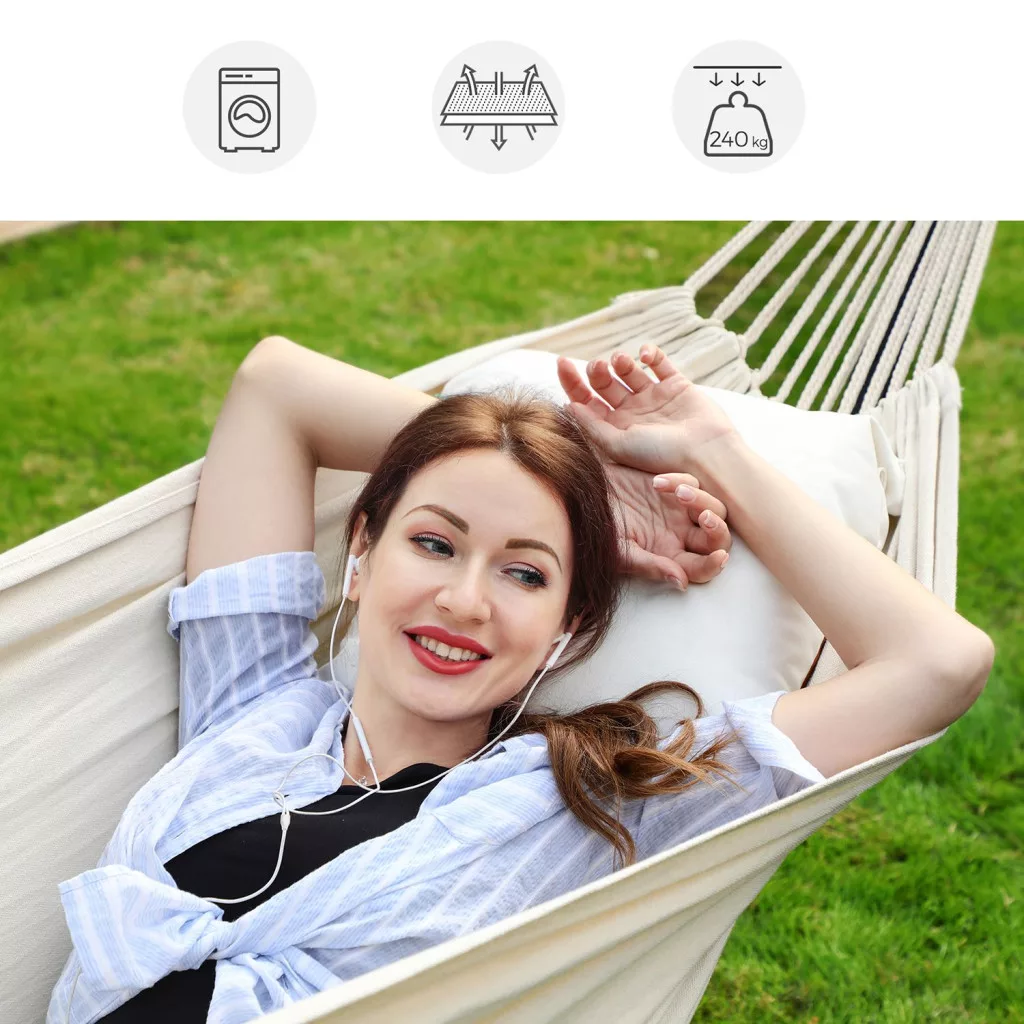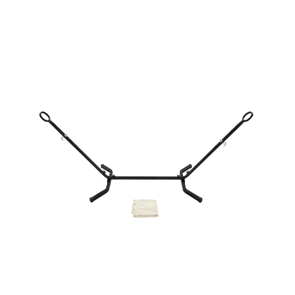 Ez a prémium minőségű függőágy állvánnyal kombinálva tökéletes megoldást nyújt a szabadtéri kikapcsolódáshoz. A lélegző pamut-poliészter anyagból készült függőágy és a stabil, fekete fém állványszerkezet egyesíti a kényelmet a praktikussággal.