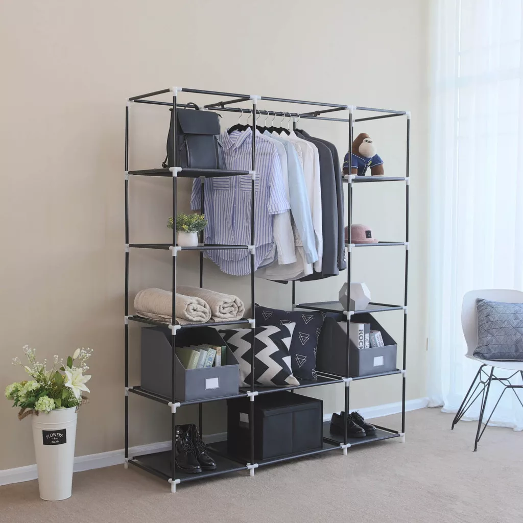 Praktikus és tágas szövet ruhásszekrény 12 rekesszel, cipőtárolóval és akasztórúddal, ideális megoldás a rendezett ruhatároláshoz.