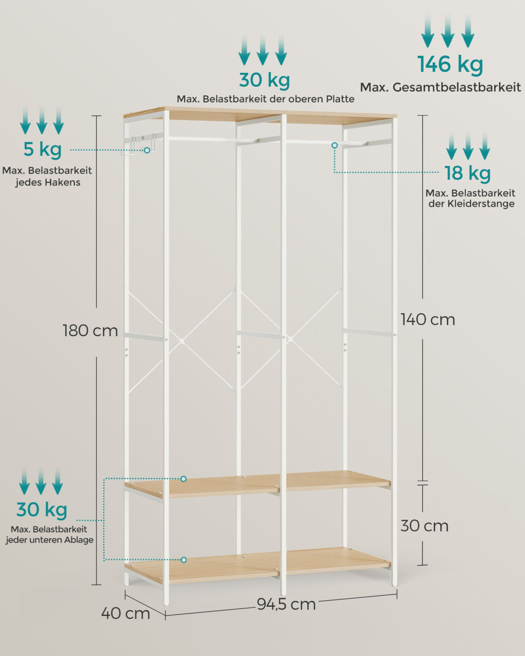 Strapabíró, tágas ruhásszekrény 146 kg teherbírással, amely tökéletes megoldást nyújt a rendezett ruhatároláshoz akár hálószobában, előszobában vagy mosókonyhában.
