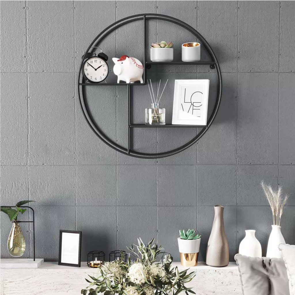 Modern, ipari stílusú kör alakú fali polc három különböző magasságú tárolófelülettel, amely tökéletes megoldást nyújt a dekoratív tároláshoz.