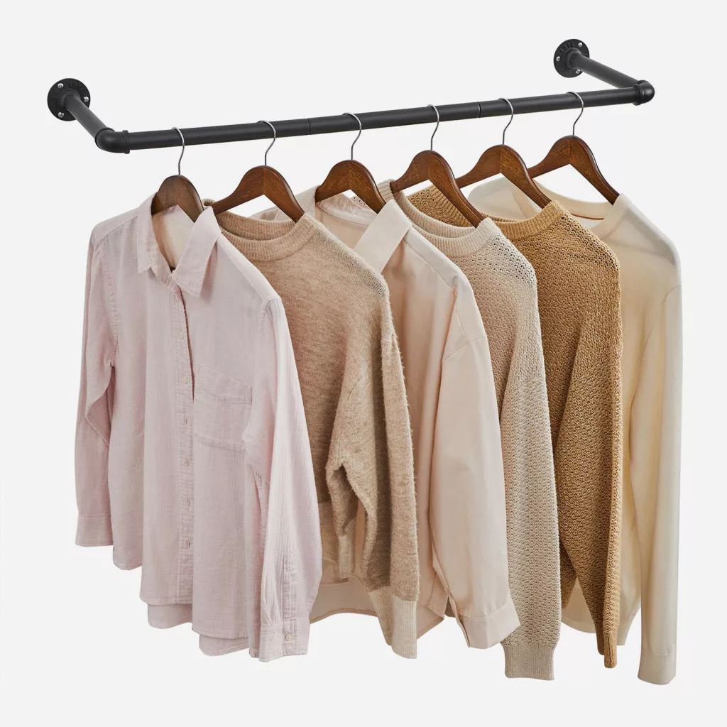 Helytakarékos, ipari stílusú fali ruhaakasztó szett, amely tökéletes megoldást nyújt a ruhák tárolására kis terekben. A robusztus acél kivitel és a modern dizájn egyesül ebben a praktikus tárolási megoldásban.