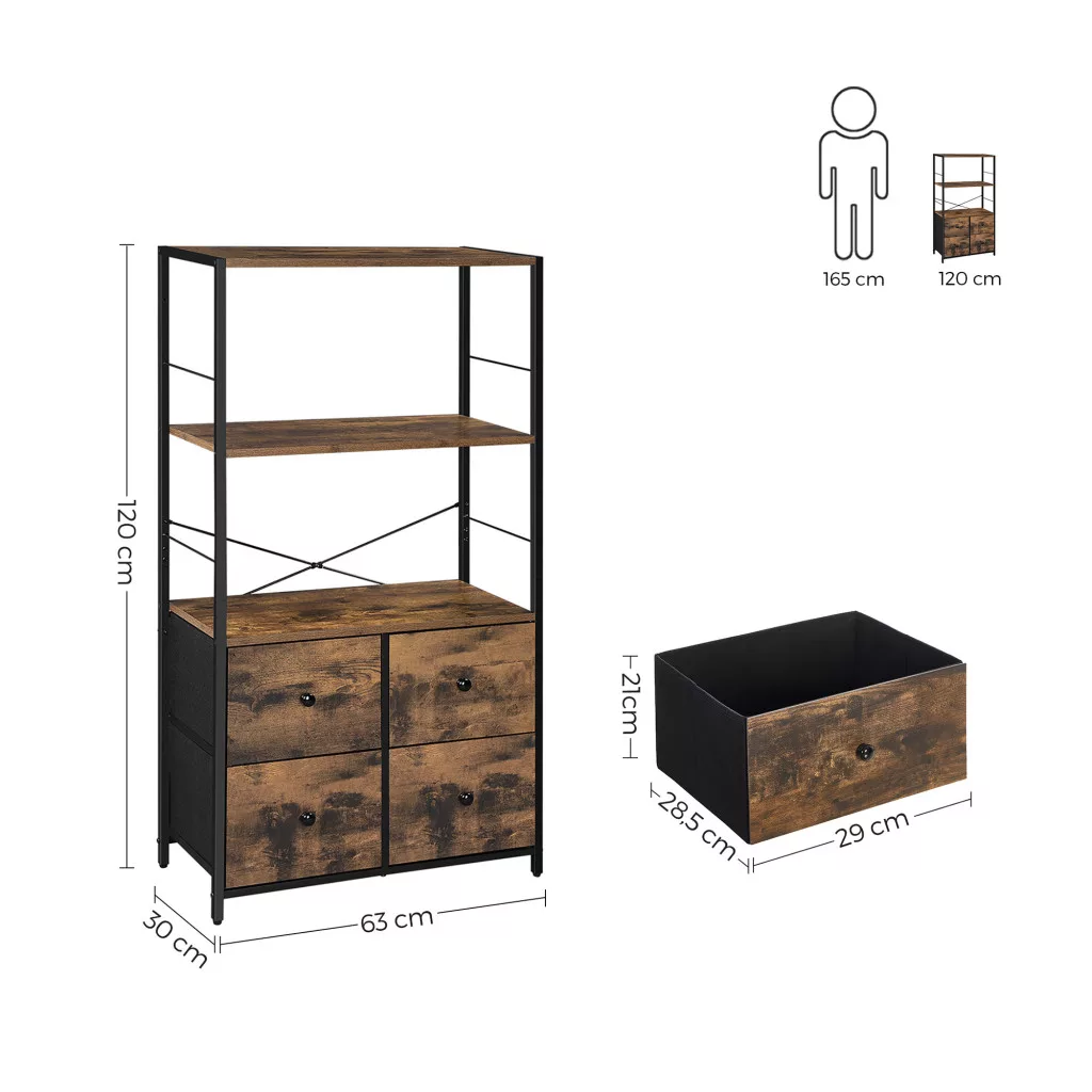 Stílusos ipari dizájnú tárolószekrény 3 nyitott polccal és 4 textil fiókkal, amely tökéletesen ötvözi a praktikus tárolást az elegáns megjelenéssel.