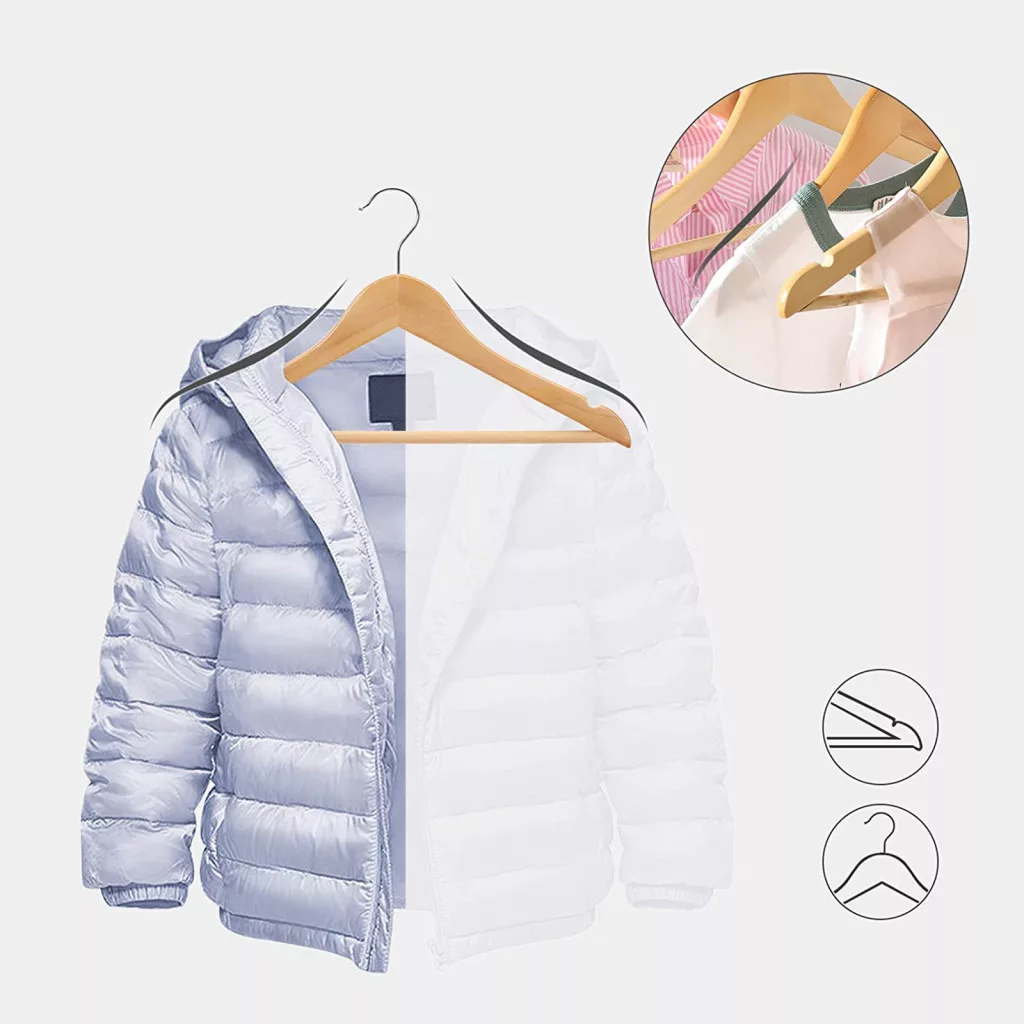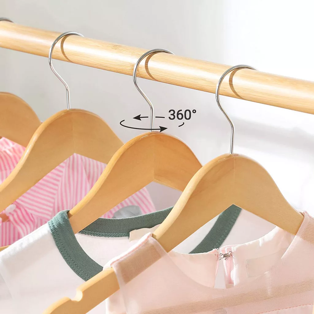 Prémium minőségű, 35 cm-es juharfa vállfák gyermekruhákhoz, nadrártartóval és 360 fokos forgatható akasztóval, ideális 7-12 éves gyerekek ruháihoz.