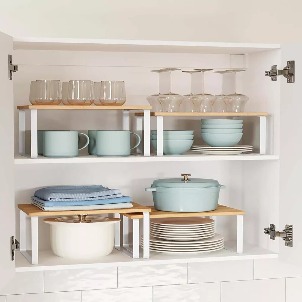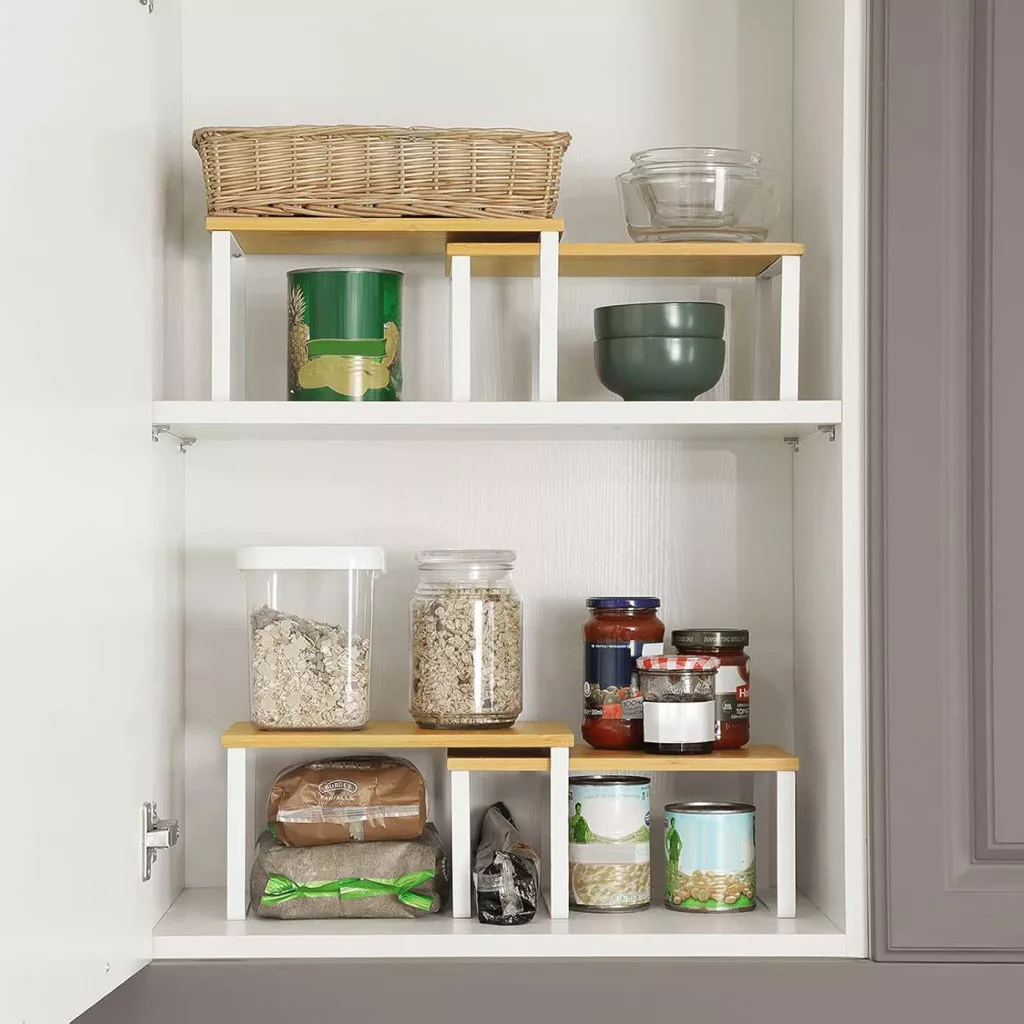 Maximalizálja konyhai tárhelyét ezzel a 4 darabos, egymásra rakható és bővíthető polcrendszerrel, amely bambusz lapokkal és fehér fém kerettel rendelkezik, és akár 15 kg terhelést is elbír polconként.