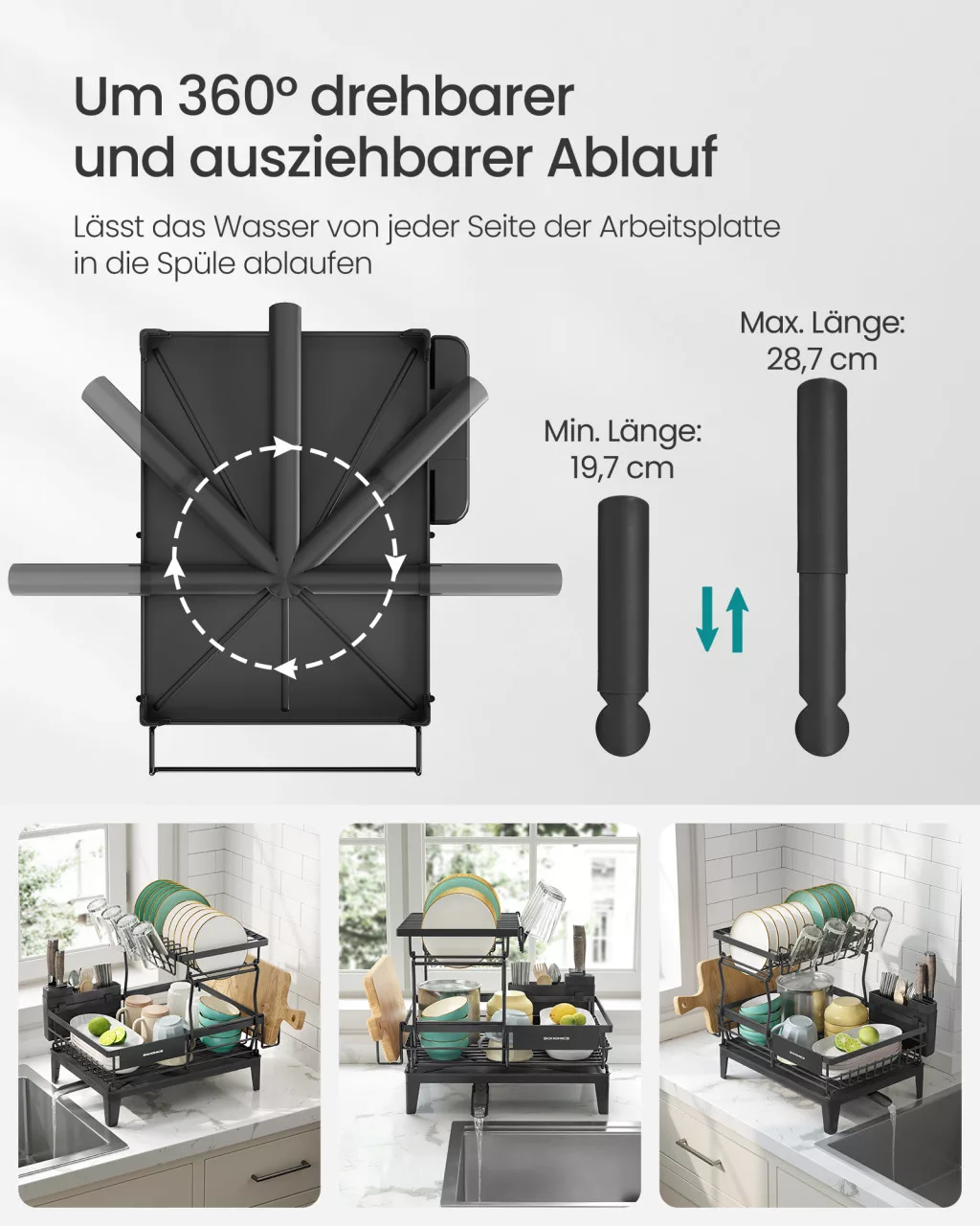Kompakt, kétszintes edényszárító állvány 360°-ban forgatható és kihúzható vízelvezető csőrrel, amely hatékonyan vezeti a vizet a mosogatóba bármely irányból. Rozsdamentes acél szerkezetével és BPA-mentes műanyag alkatrészeivel biztonságos és tartós megoldást kínál a konyhapult rendszerezéséhez.
