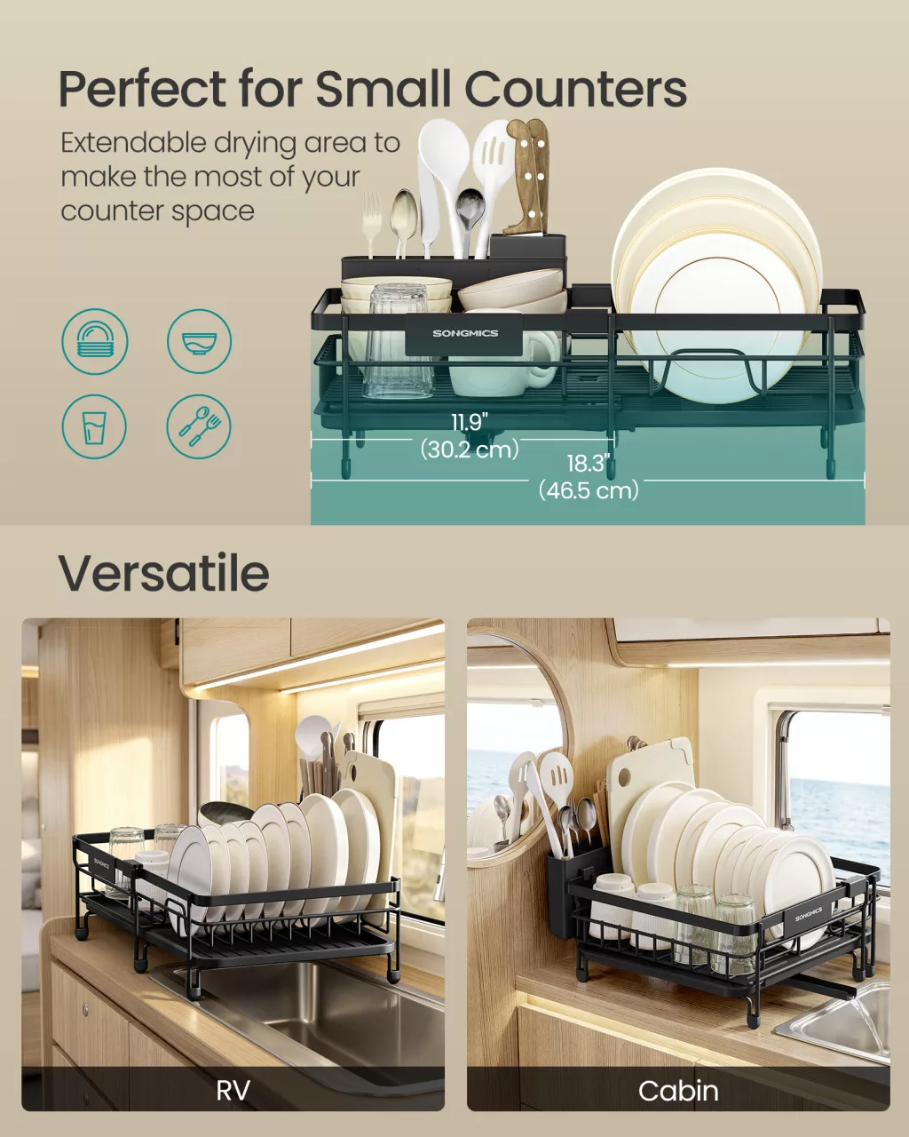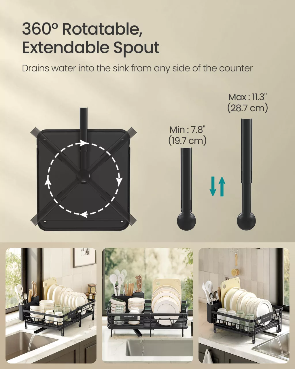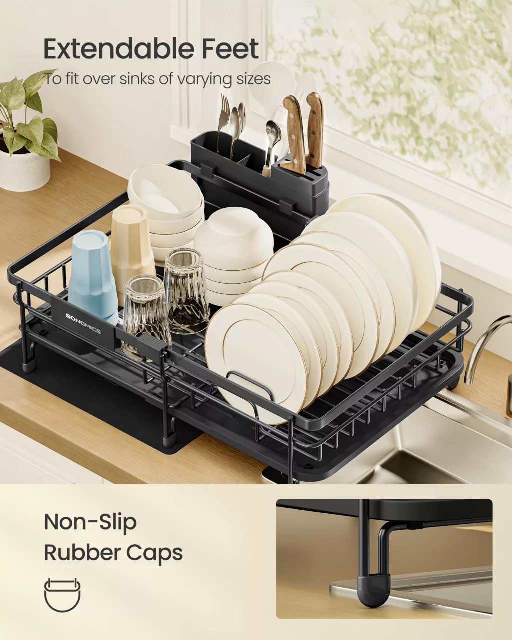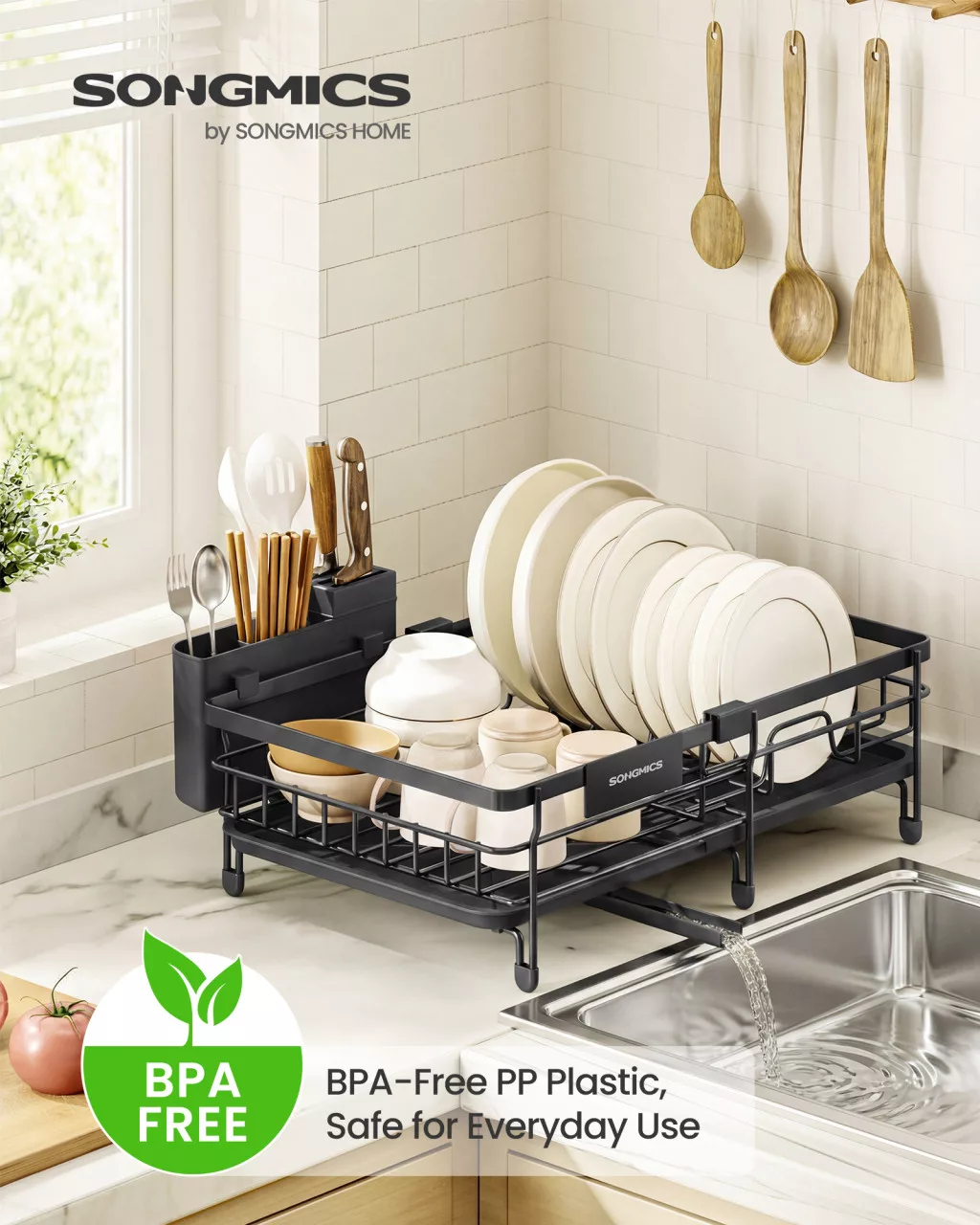 A SONGMICS bővíthető edényszárító tökéletes megoldás kis konyhákhoz. 360°-ban forgatható csőrrel, nagy kapacitással és rozsdamentes acél szerkezettel biztosítja az edények hatékony szárítását.