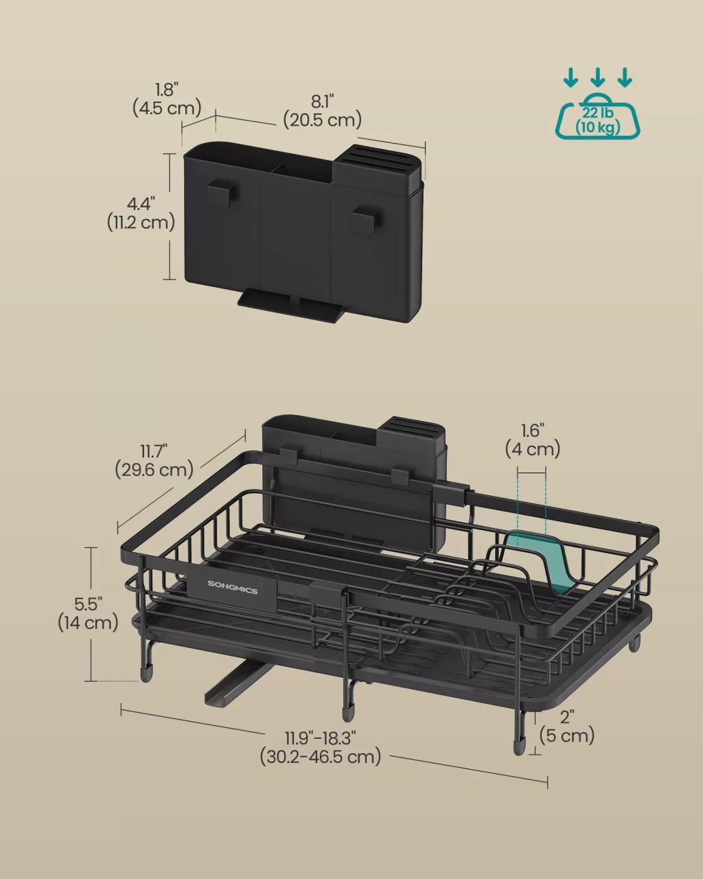 A SONGMICS edényszárító tökéletes választás azok számára, akik kis konyhában vagy lakásban élnek, de nem szeretnének lemondani a rendezett és praktikus edényszárításról. A kompakt, 30,2 cm-es alapméretből 46,5 cm-re bővíthető szerkezet lehetővé teszi, hogy pontosan annyi helyet foglaljon el, amennyire szükség van. Az elegáns tintafekete kivitel modern megjelenést kölcsönöz a konyhának, miközben a rozsdamentes acél és BPA-mentes PP műanyag anyagok hosszú élettartamot és biztonságos használatot garantálnak.