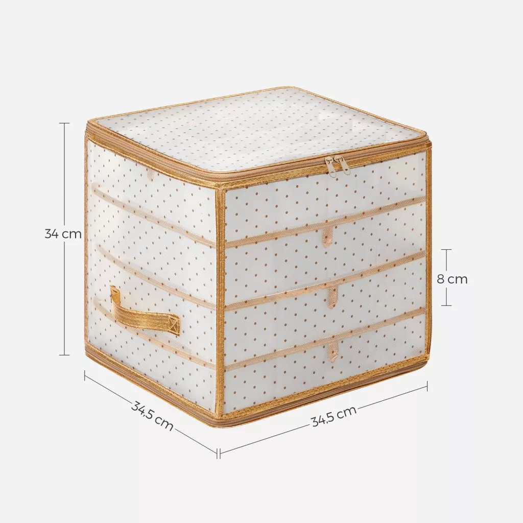 A SONGMICS karácsonyi gömbtároló dobozok tökéletes megoldást nyújtanak az ünnepi dekorációk rendszerezett és biztonságos tárolására. Az átlátszó falaknak köszönhetően azonnal megtalálja a keresett díszeket, míg az arany szegély és pöttyös minta elegáns megjelenést kölcsönöz. A két doboz összesen 128 rekeszt kínál különböző méretű gömbök és díszek számára.
