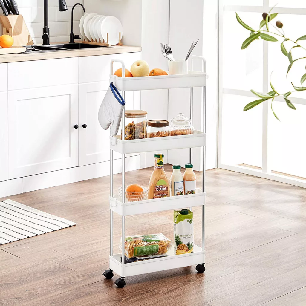 Praktikus, keskeny tárolókocsi 4 szinttel, amely tökéletesen illeszkedik szűk helyekre. Ideális megoldás fürdőszobai, konyhai vagy háztartási eszközök rendszerezett tárolására.