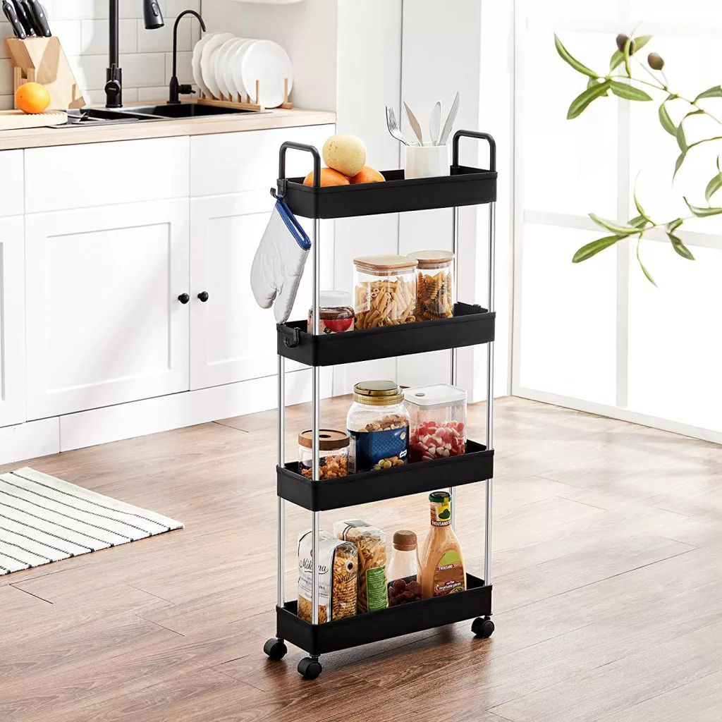 Praktikus, keskeny tárolókocsi 4 szinttel, ideális szűk terekbe. Görgős kivitel és fogantyúk a könnyű mozgathatóságért, tökéletes fürdőszobai és konyhai rendszerezéshez.