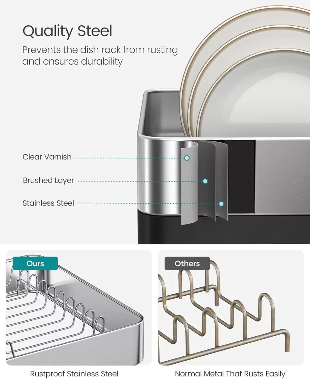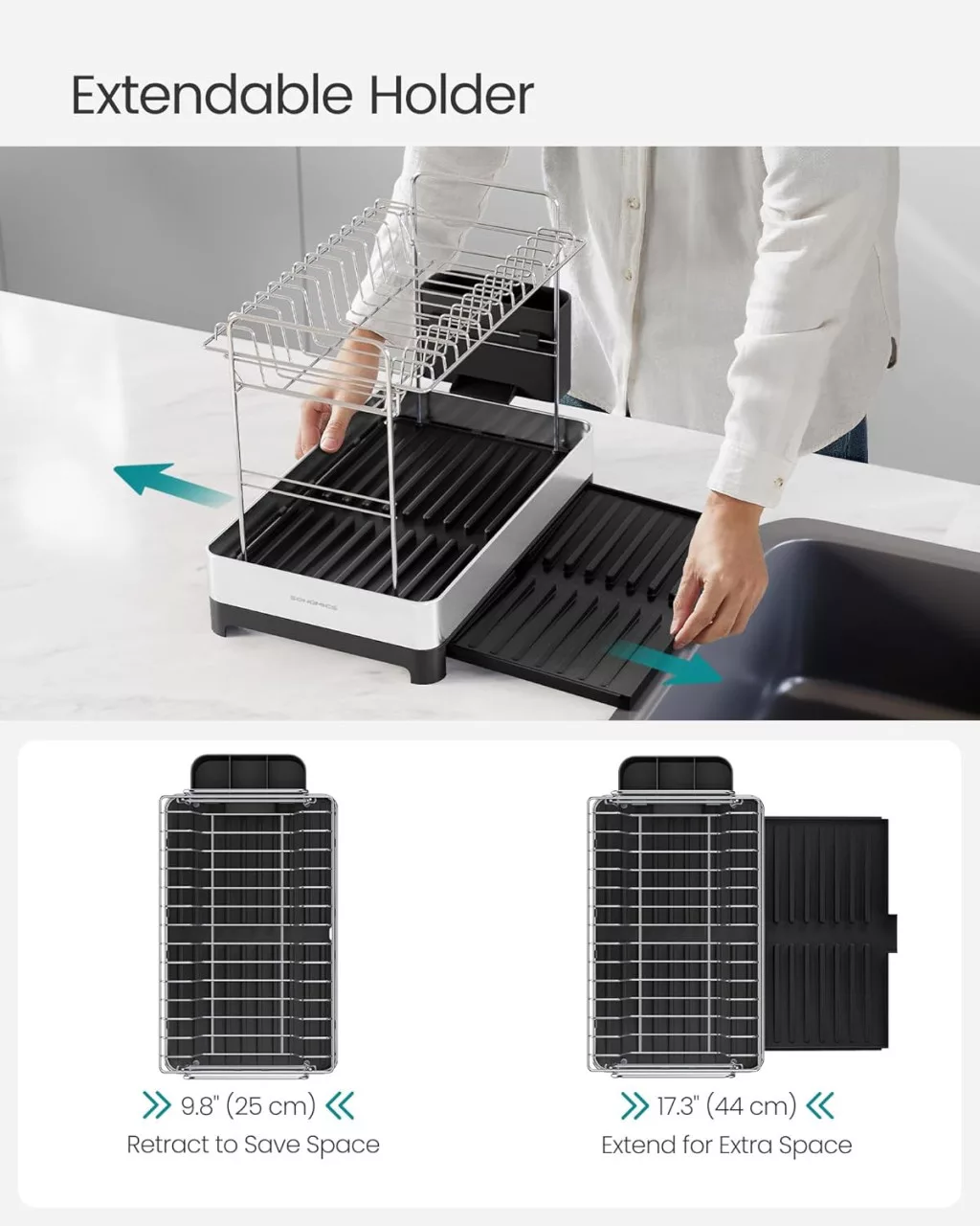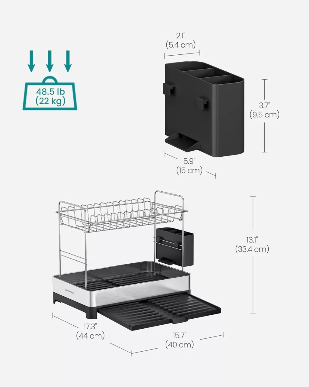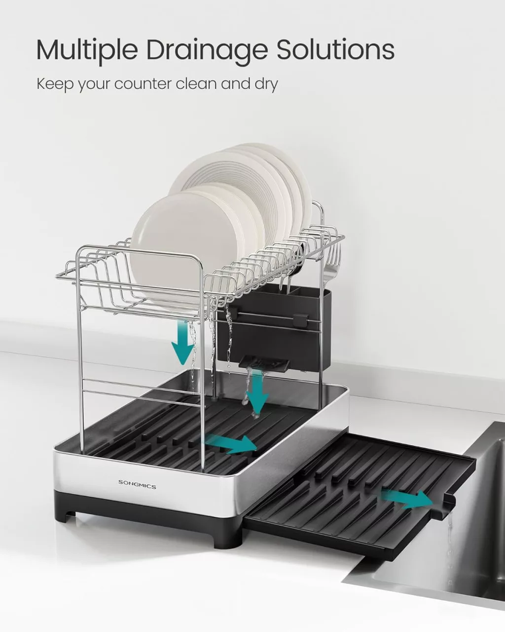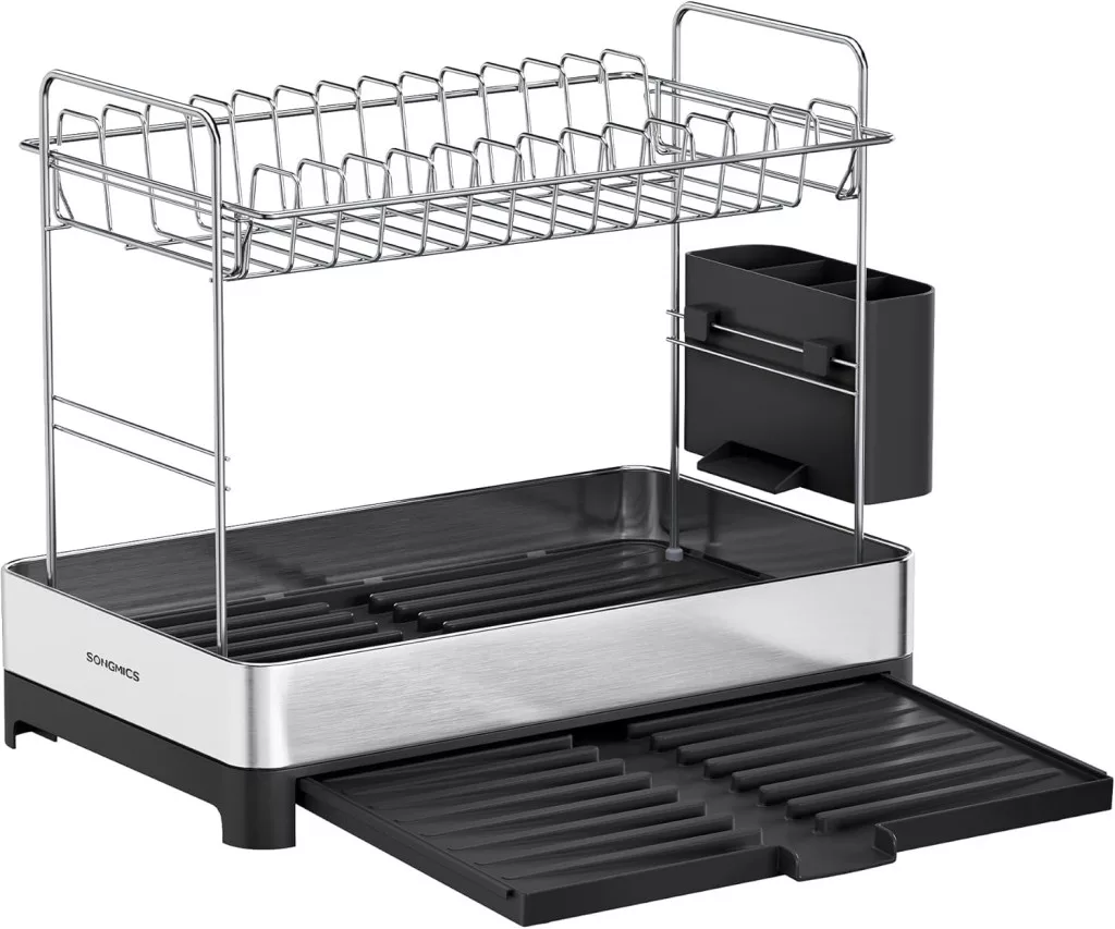 SONGMICS Kétemeletes Bővíthető Rozsdamentes Acél Edényszárító Állvány Evőeszköztartóval