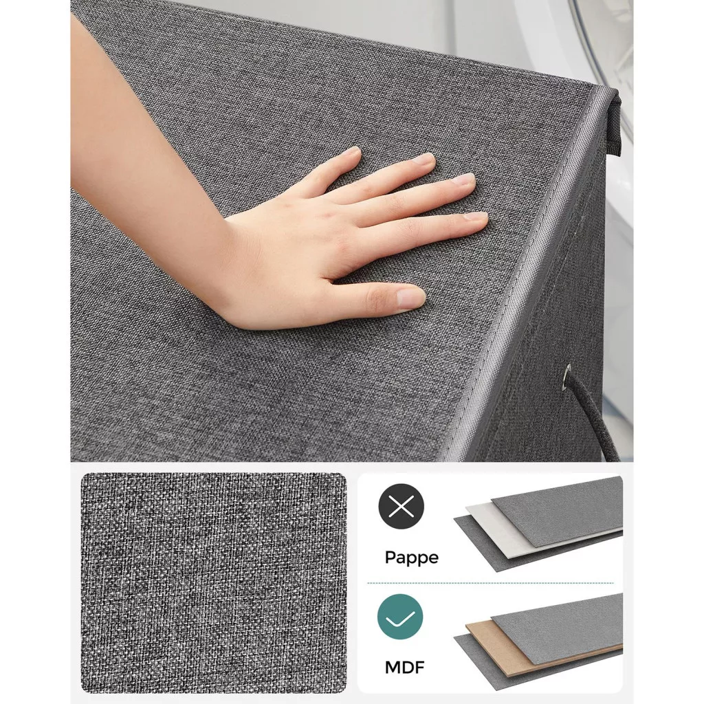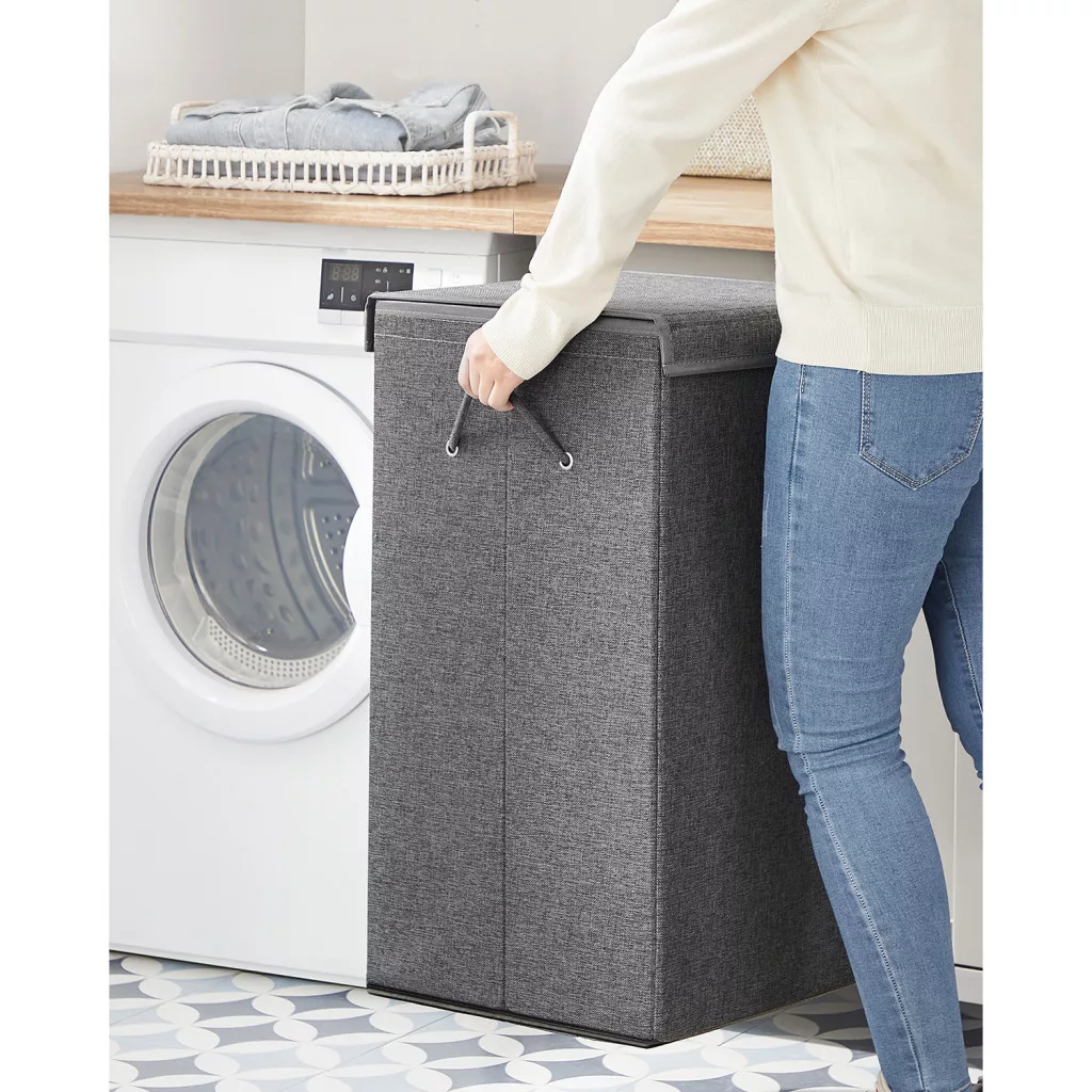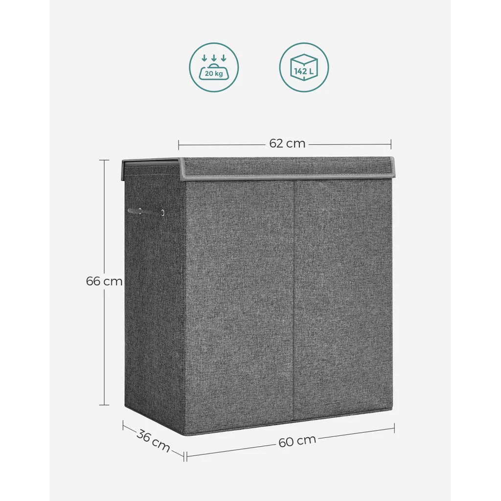 Nagy kapacitású, 142 literes szennyestartó kosár két rekesszel, stílusos vászon hatású anyagból, praktikus mágneses fedéllel és kivehető bélészsákkal.