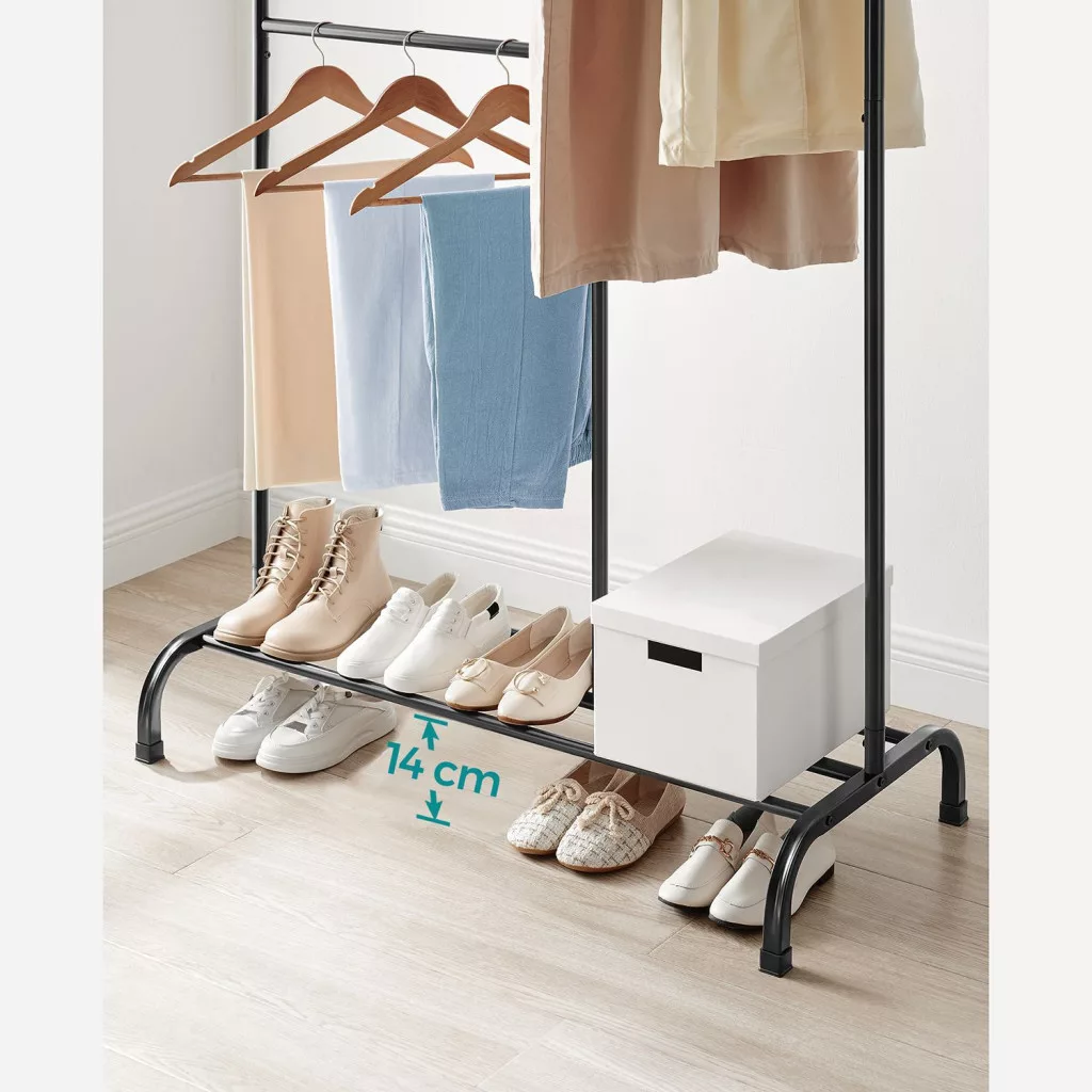 A ruhaállvány alsó polca ideális cipők, táskák vagy dobozok tárolására, így maximálisan kihasználhatja a rendelkezésre álló teret. A fekete színű, időtálló dizájn bármilyen lakberendezési stílushoz harmonikusan illeszkedik.