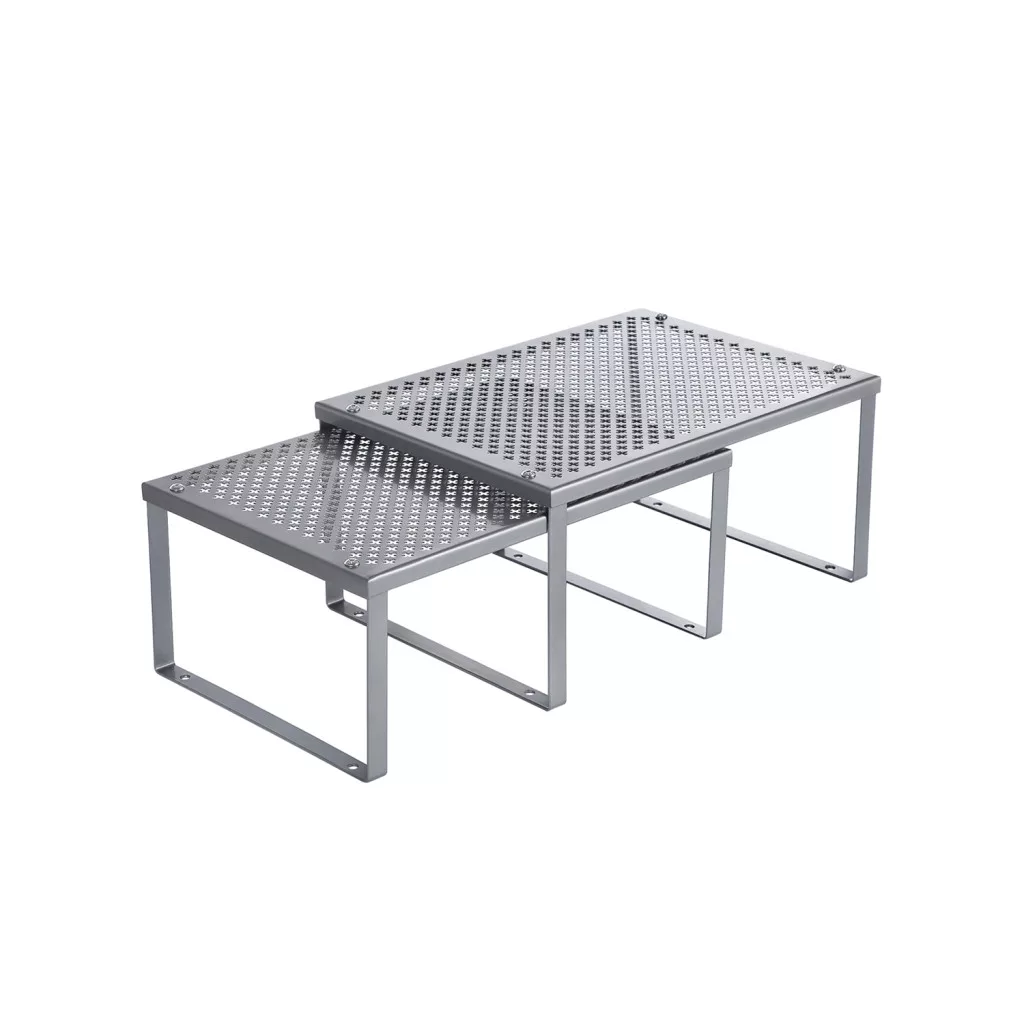 Ez a praktikus kétszintes konyhai állvány tökéletes megoldást nyújt a konyhai tárolóhely optimalizálására. A perforált fém polcok nem csak stílusosak, de rendkívül stabilak is, polconként akár 10 kg terhelést is elbírnak. Az állványok rugalmasan használhatók egymás mellett, alatt vagy L-alakban elrendezve.