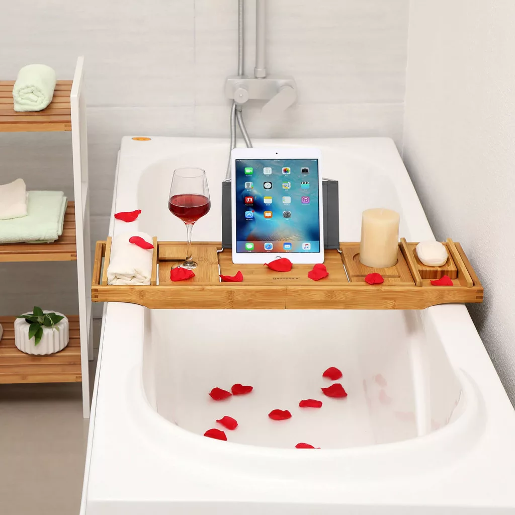 Luxus fürdőélmény otthon - kihúzható bambusz fürdőkád tálca tablettartóval, pohártartóval és praktikus tárolórekeszekkel, amely tökéletes kiegészítője a pihentető fürdőzésnek.