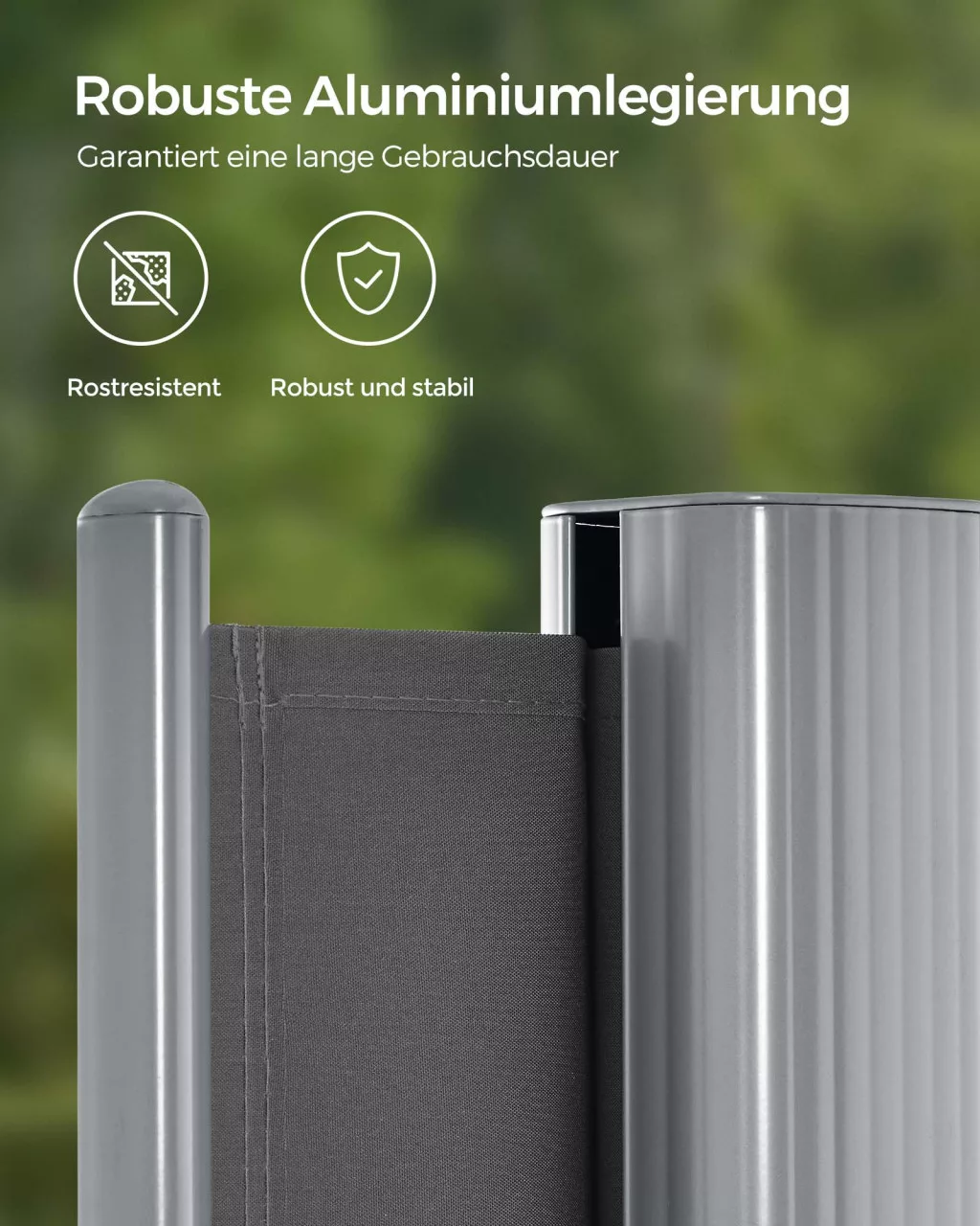 Ez a prémium minőségű oldalsó napellenző tökéletes megoldást kínál a terasz vagy erkély napfény és kíváncsi tekintetek elleni védelmére. A 280 g/m² sűrűségű, PU bevonattal ellátott poliészter anyag hatékonyan véd az UV-sugárzástól és az enyhe esőtől.