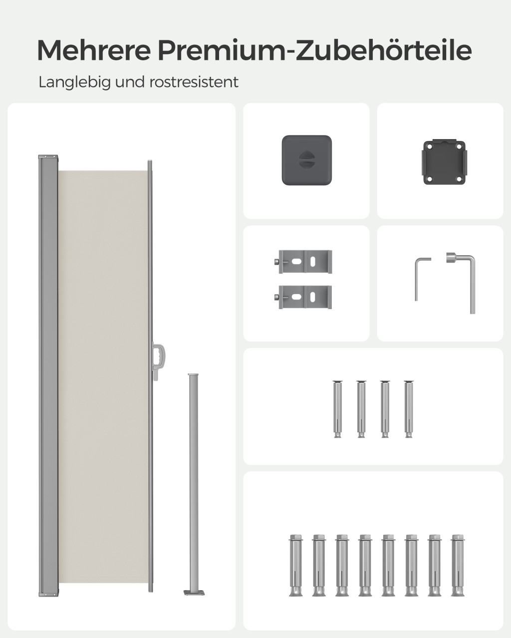 Kiváló minőségű, por- és rozsdaálló oldalsó napellenző, amely tökéletes védelmet nyújt a kíváncsi tekintetek és a nap ellen a teraszon vagy erkélyen.