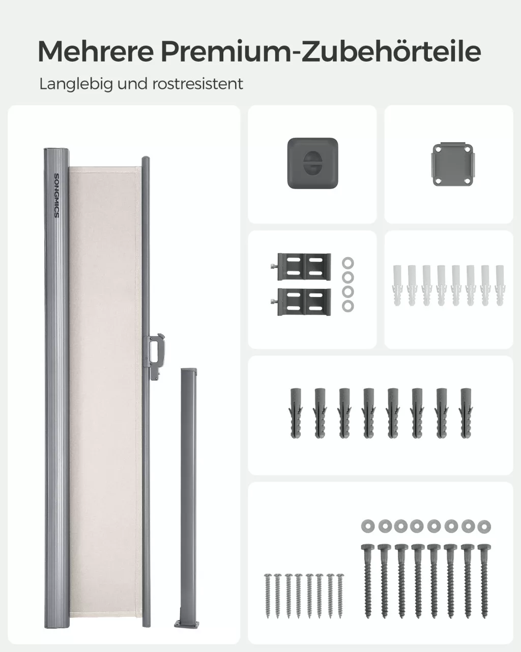 Ez a modern kialakítású oldalsó napellenző tökéletes megoldást kínál a terasz vagy erkély napvédelmére és a privátszféra megőrzésére. A rozsdamentes alumínium szerkezet és a 280 g/m² sűrűségű, PU bevonatú poliészter anyag tartós és időjárásálló védelmet biztosít.