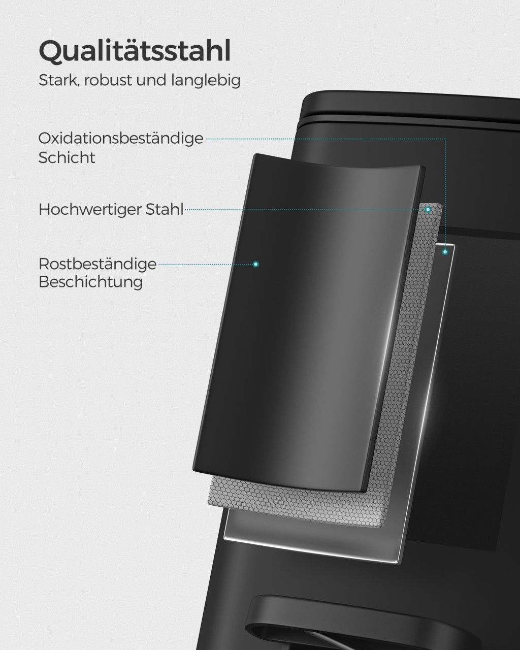 A rozsdamentes acél konstrukció és a szigetelt fedél megakadályozza a kellemetlen szagok kiszivárgását és a nedvesség bejutását. A kivehető belső vödör és a hátsó fogantyú megkönnyíti a tisztítást és a mozgatást.