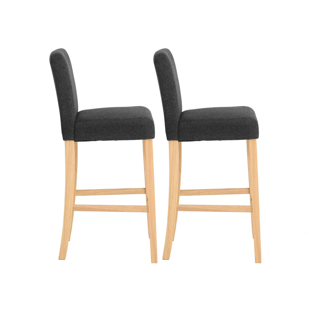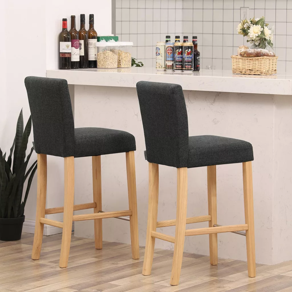Elegáns és kényelmes bárszék páros természetes fa lábakkal és sötétszürke vászon kárpitozással, tökéletes választás otthoni bárpulthoz vagy konyhaszigethez.