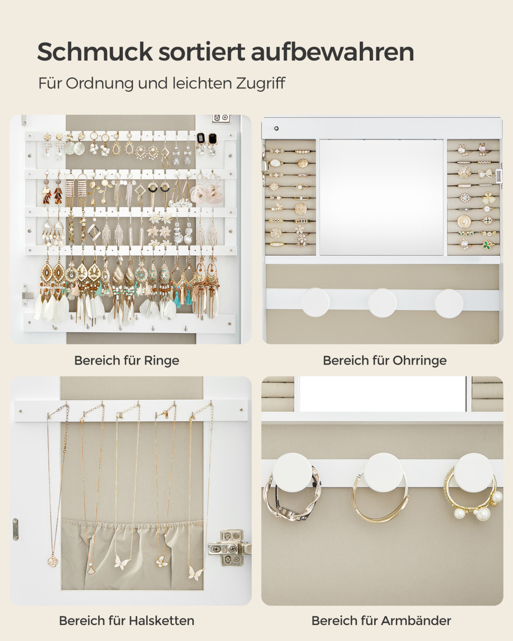 SONGMICS LED Tükrös Ékszertároló Szekrény Falra Szerelhető Lekerekített Dizájnnal Fehér
