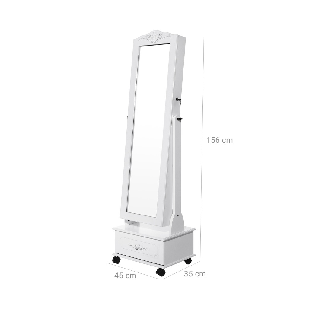 Elegáns, fehér ékszertartó szekrény LED világítással, nagy tárolókapacitással és állítható tükörrel, amely tökéletes megoldást nyújt ékszerei rendszerezett tárolására.