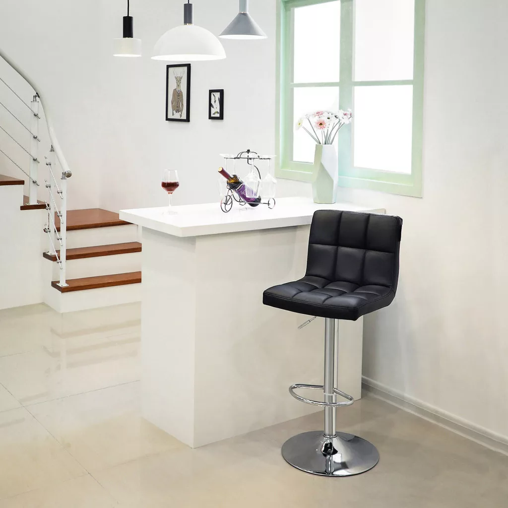 Elegáns és kényelmes bárszék pár fekete műbőr kárpittal, magasságállítással és 360°-os forgathatósággal, tökéletes választás modern konyhákhoz és bárpultokhoz.
