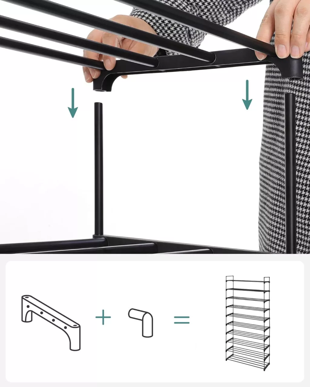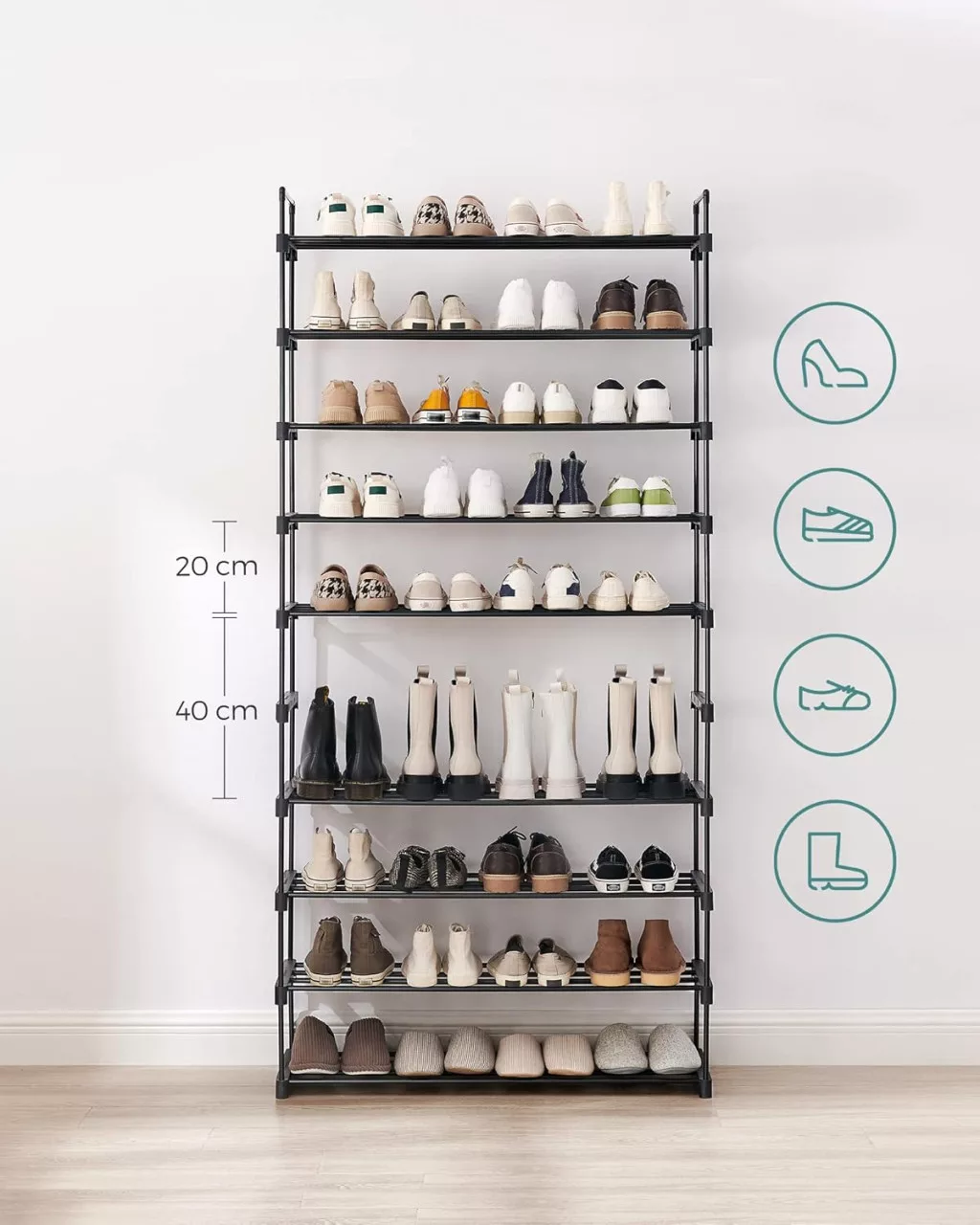 A SONGMICS 10 szintes cipőtartó állvány akár 50 pár cipő tárolására alkalmas, miközben karcsú kialakításának köszönhetően minimális helyet foglal. Moduláris felépítése és állítható magassága révén tökéletes megoldás előszobába, öltözőbe vagy gardróbba.