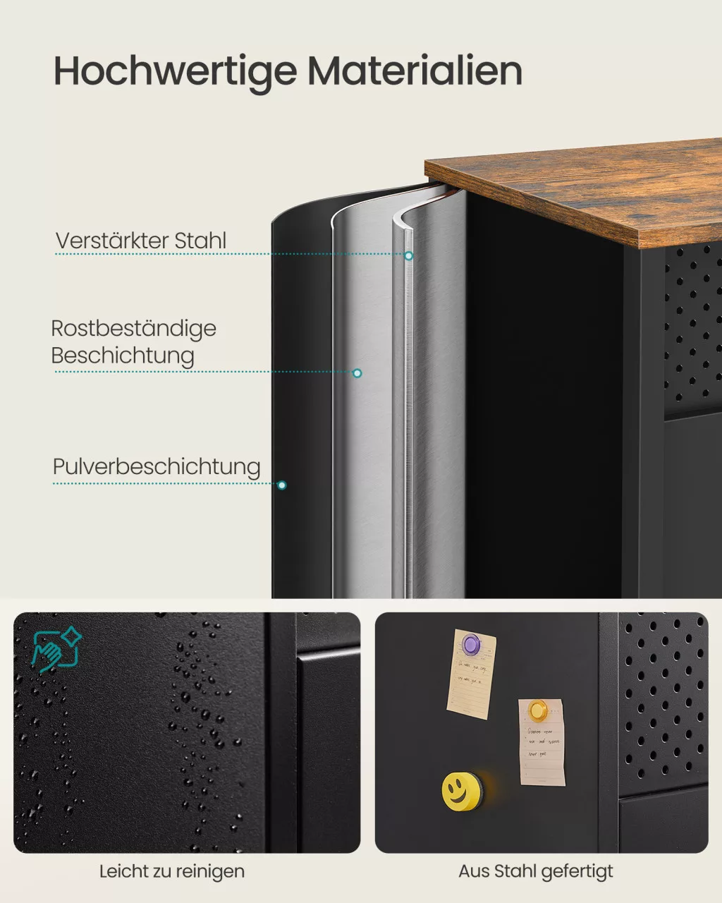• Perforált hátlap: A speciális lyukacsos kialakítás nemcsak kiváló szellőzést biztosít, hanem lehetőséget ad akasztók felhelyezésére is, így személyes tárgyak is könnyen elérhetők maradnak