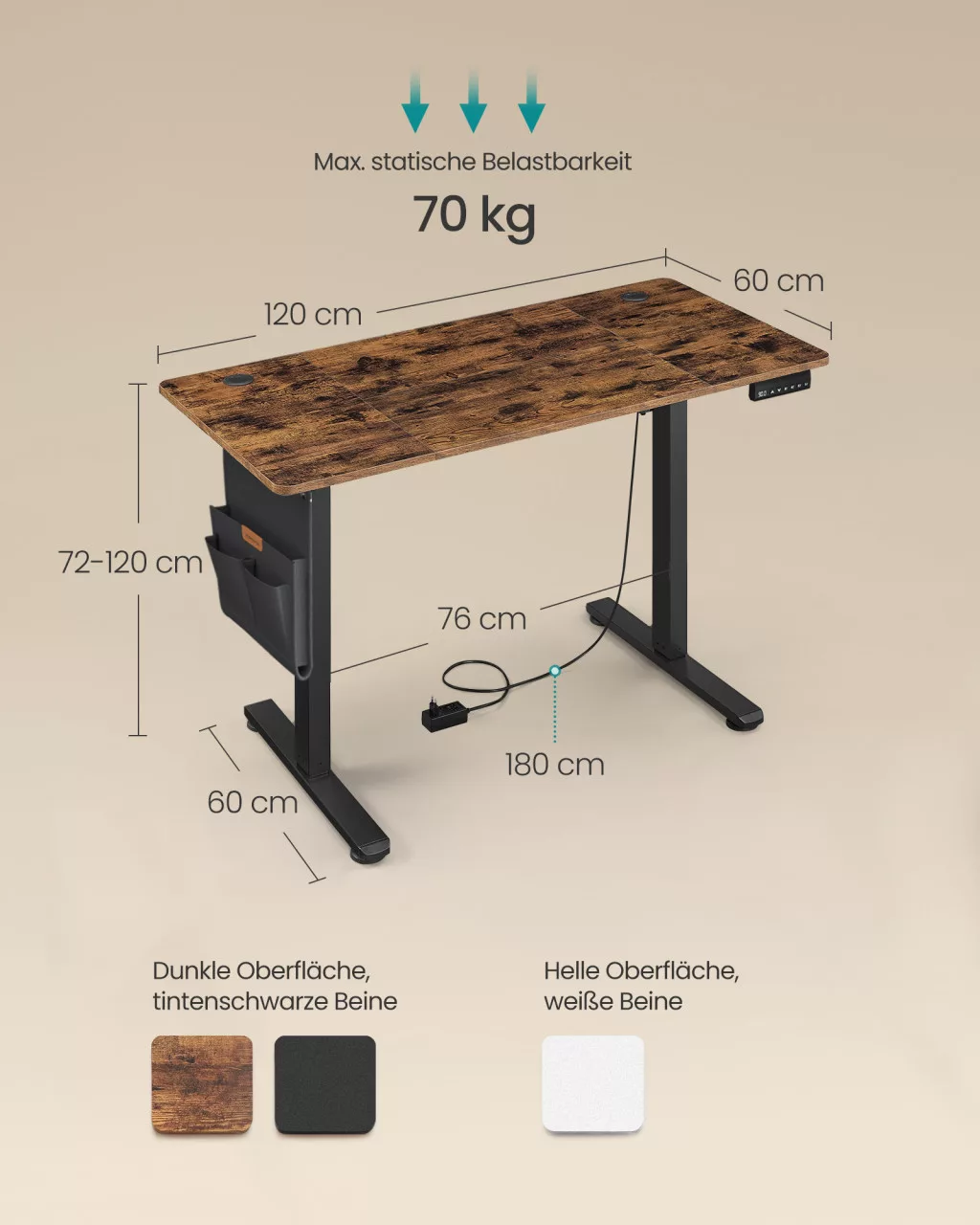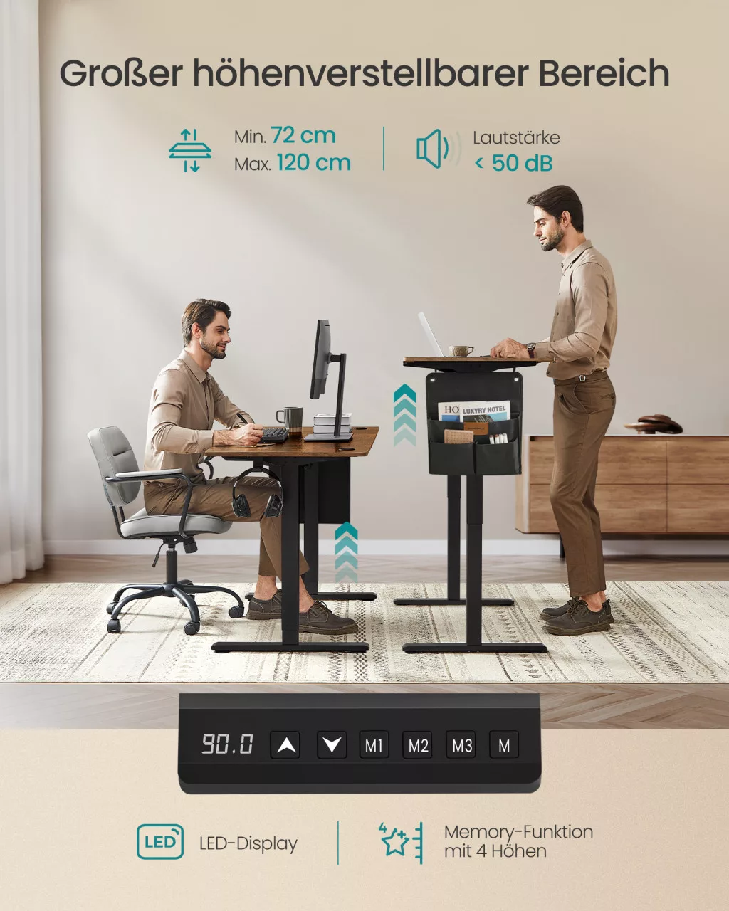 A SONGMICS elektromos állóasztal forradalmasítja otthoni munkakörnyezetét azzal, hogy lehetővé teszi a magasság egyszerű állítását 72 és 120 cm között. A beépített memóriafunkció 4 különböző magasság elmentését teszi lehetővé, így egyetlen gombnyomással válthat kedvenc pozíciói között. A stabil acélváz és a vastag asztallap akár 70 kg terhelést is elbír, miközben a kiváló minőségű motor csendes és sima működést biztosít 48 dB alatti zajszinttel.