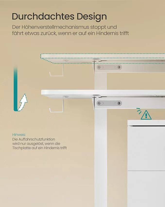 Az asztal számos okos megoldással rendelkezik: Oxford szövetből készült rendszerező, fejhallgató tartó kampó, kábelrendező nyílások és 4 programozható magassági beállítás. A beépített biztonsági rendszer azonnal megáll és visszahúzódik, ha akadályba ütközik.