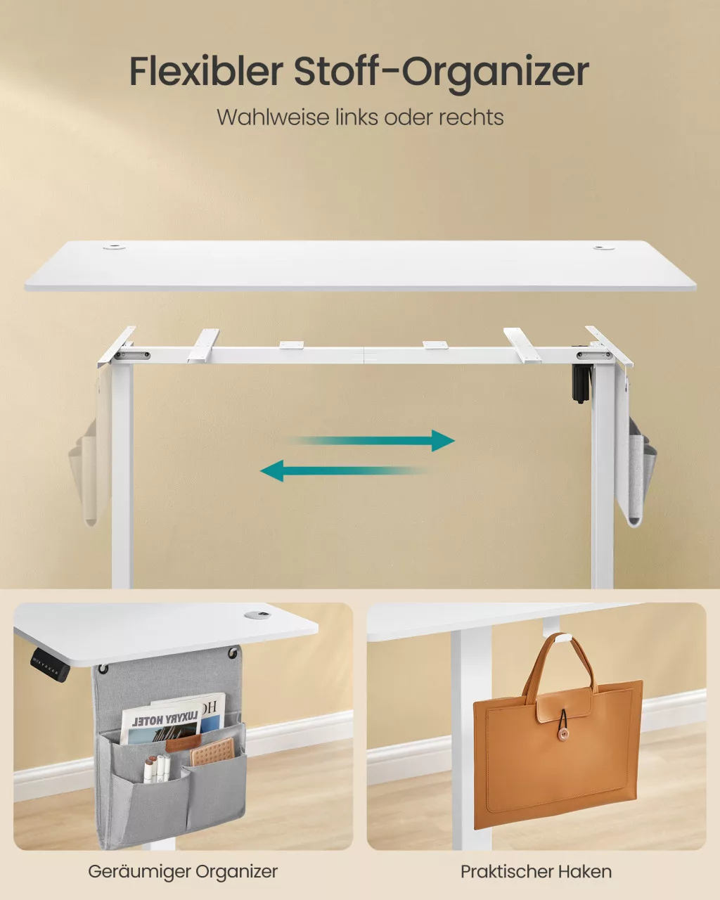• Rendezett munkaterület: A beépített kábelrendező nyílások, a textil rendszerező zseb és a praktikus kampók segítségével minden eszköz a helyén marad, így Ön a munkájára koncentrálhat