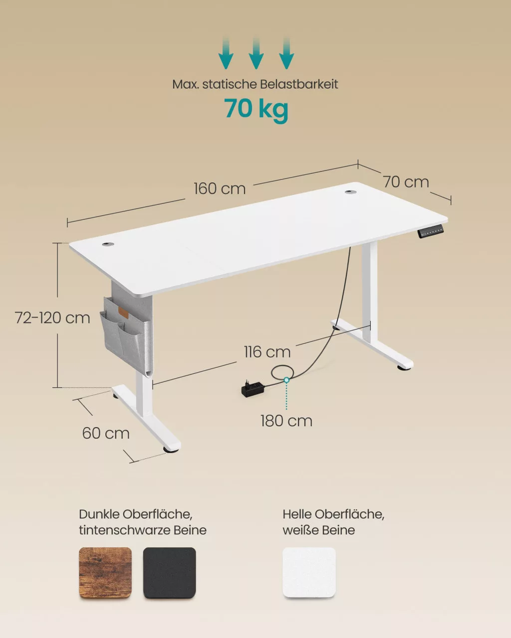 A SONGMICS elektromosan állítható magasságú íróasztala 72-120 cm között szabályozható, 4 memóriahellyel, amely lehetővé teszi az egészséges munkahelyzet kialakítását ülve és állva egyaránt. A tágas 180 x 80 cm-es asztallappal, csendes motorral és praktikus kiegészítőkkel felszerelt íróasztal tökéletes választás az otthoni irodához.