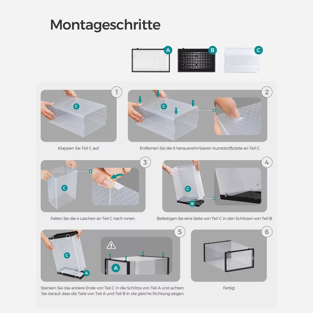 • Átlátszó PP anyag elülső ajtóval: Első pillantásra láthatja cipőgyűjteményét, és a praktikus elülső ajtó gyors, kényelmes hozzáférést biztosít