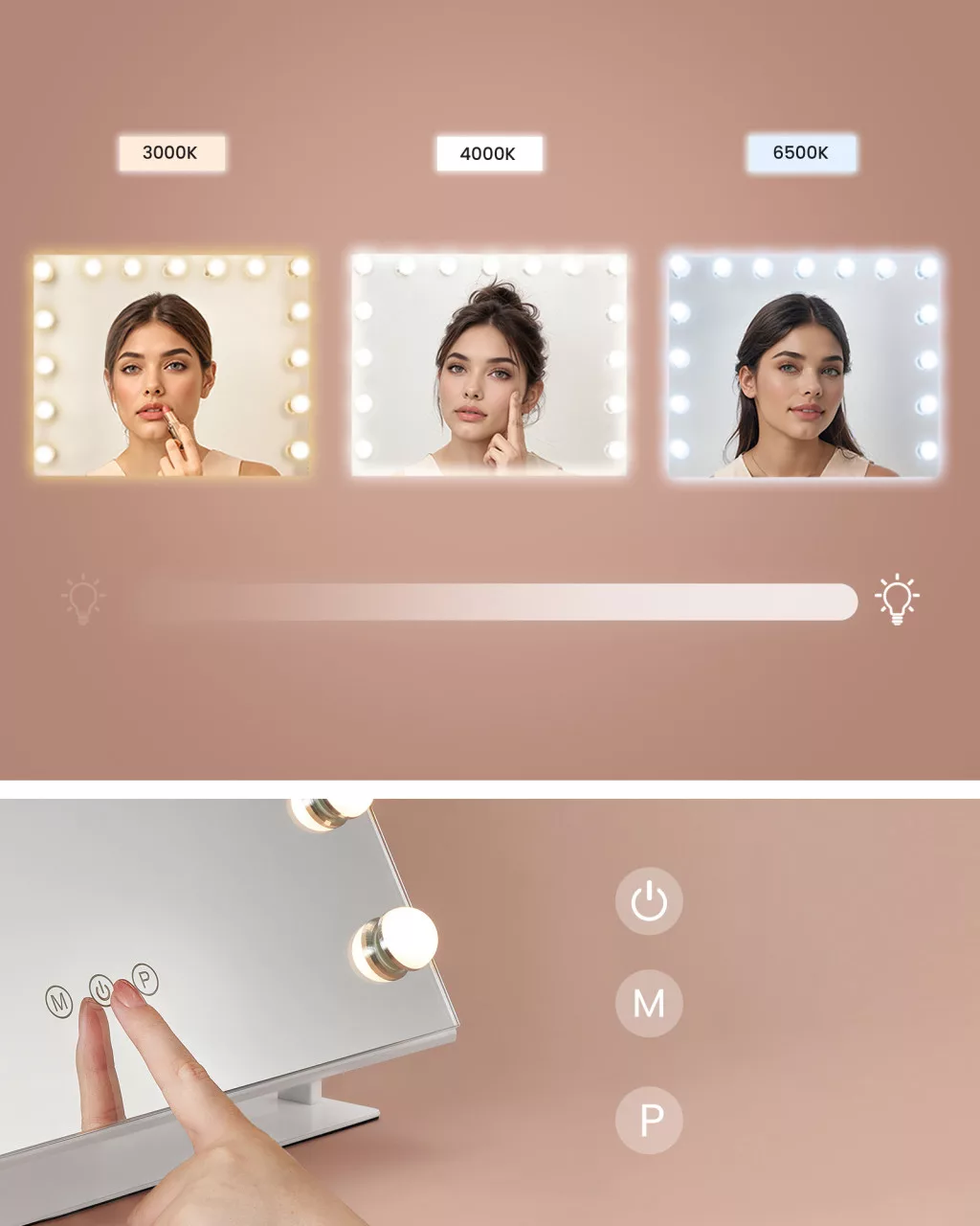 • 15 LED izzó 3 színhőmérséklettel: Professzionális stúdióminőségű megvilágítás, amely pontosan mutatja a smink valódi színeit és árnyalatait minden fényviszony mellett