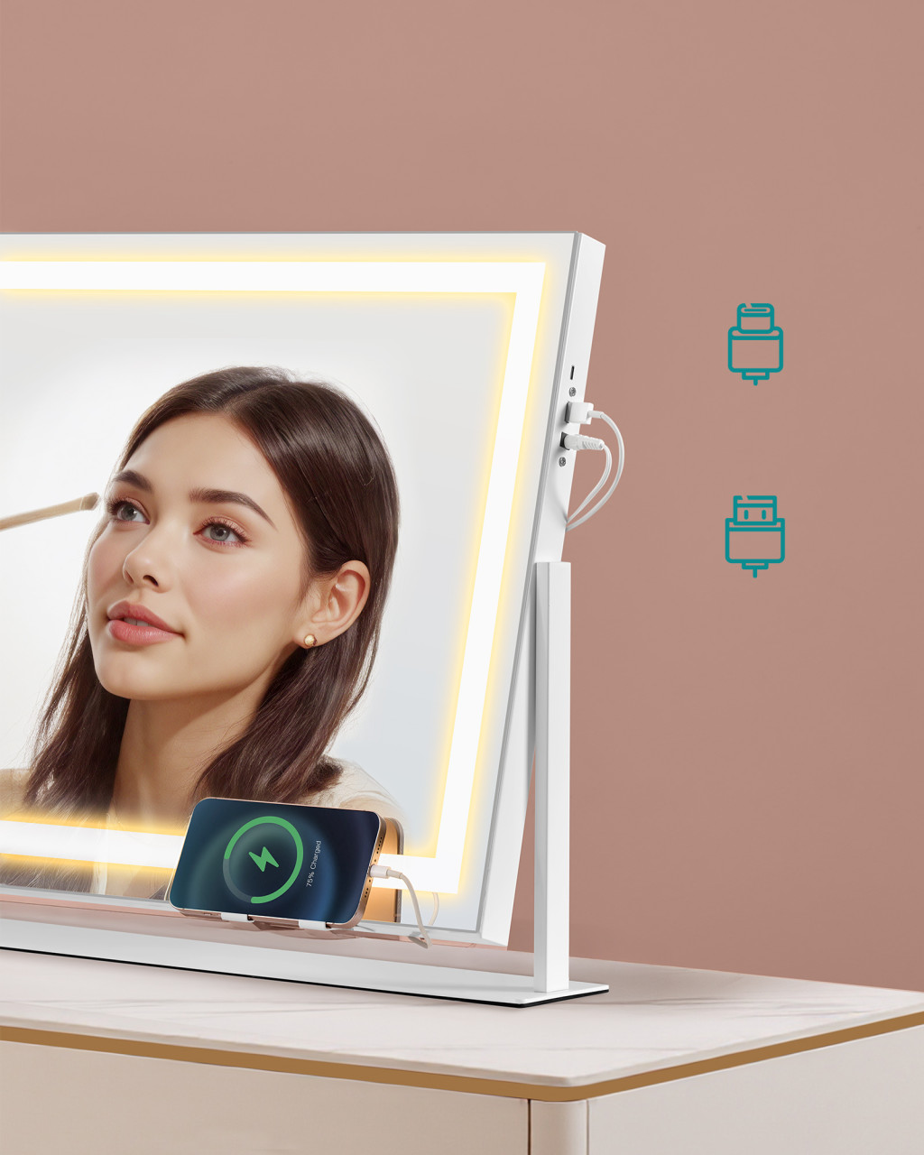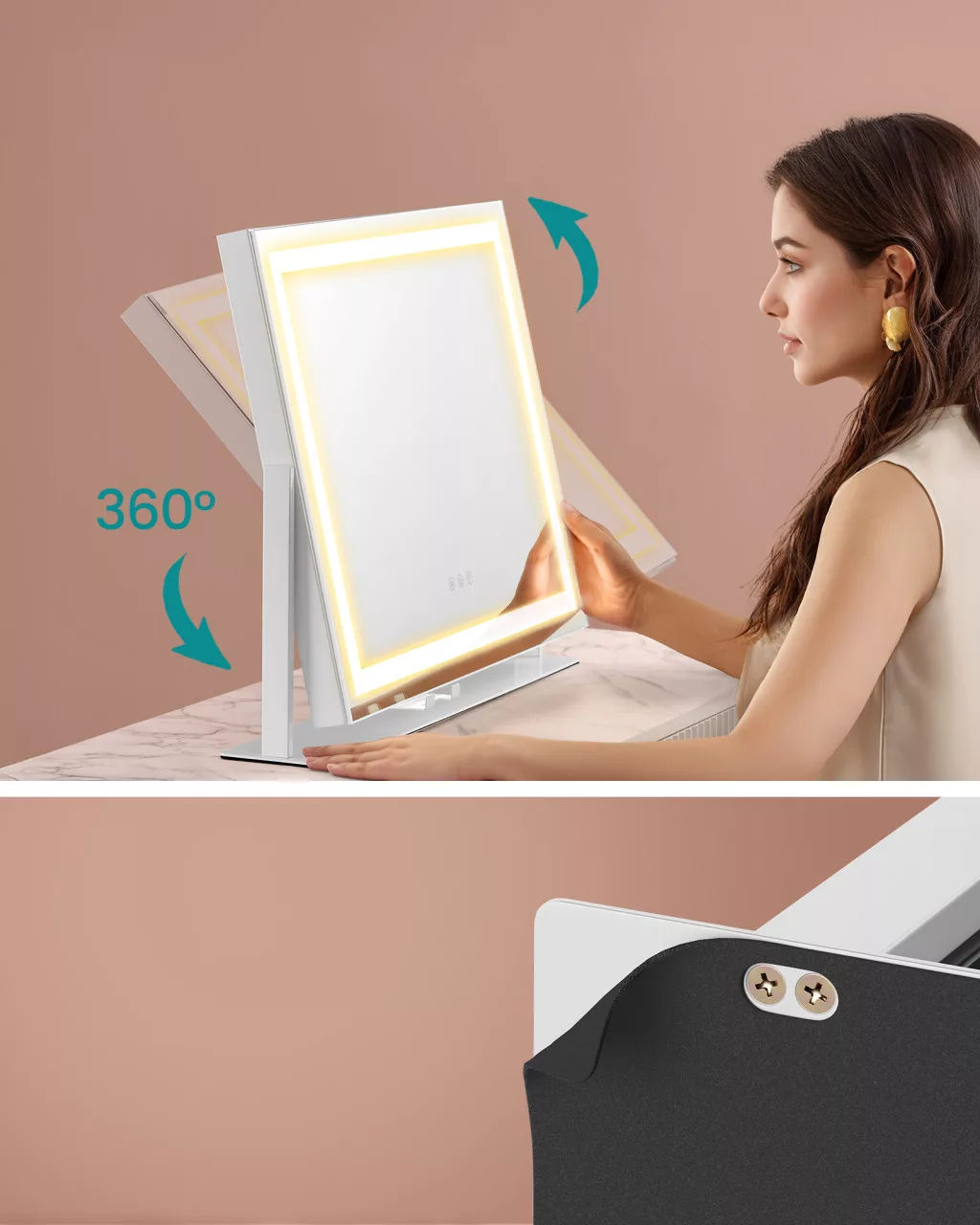 A 360°-ban forgatható tükör bármilyen magasságú fésülködőasztalhoz igazítható, míg a csúszásmentes acél talp stabilitást garantál. A beépített USB-A és USB-C portok lehetővé teszik eszközei töltését szépségápolás közben, a telefontartó pedig ideális videók nézéséhez vagy sminktutorialok követéséhez. A mellékelt 10x-es nagyítótükör precíz munkát tesz lehetővé, mint a szempillaspirál vagy szemceruza felvitele. Az FSC tanúsítvánnyal rendelkező, matt fehér tükör elegáns kiegészítője bármely hálószobának vagy öltözőnek.