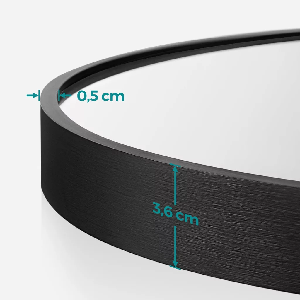Elegáns, 61 cm átmérőjű kerek fali tükör fekete alumínium kerettel, amely időtlen stílusával és kiváló minőségével bármely helyiséget feldobja. Tartós konstrukció, egyszerű felszerelés és sokoldalú felhasználhatóság jellemzi.