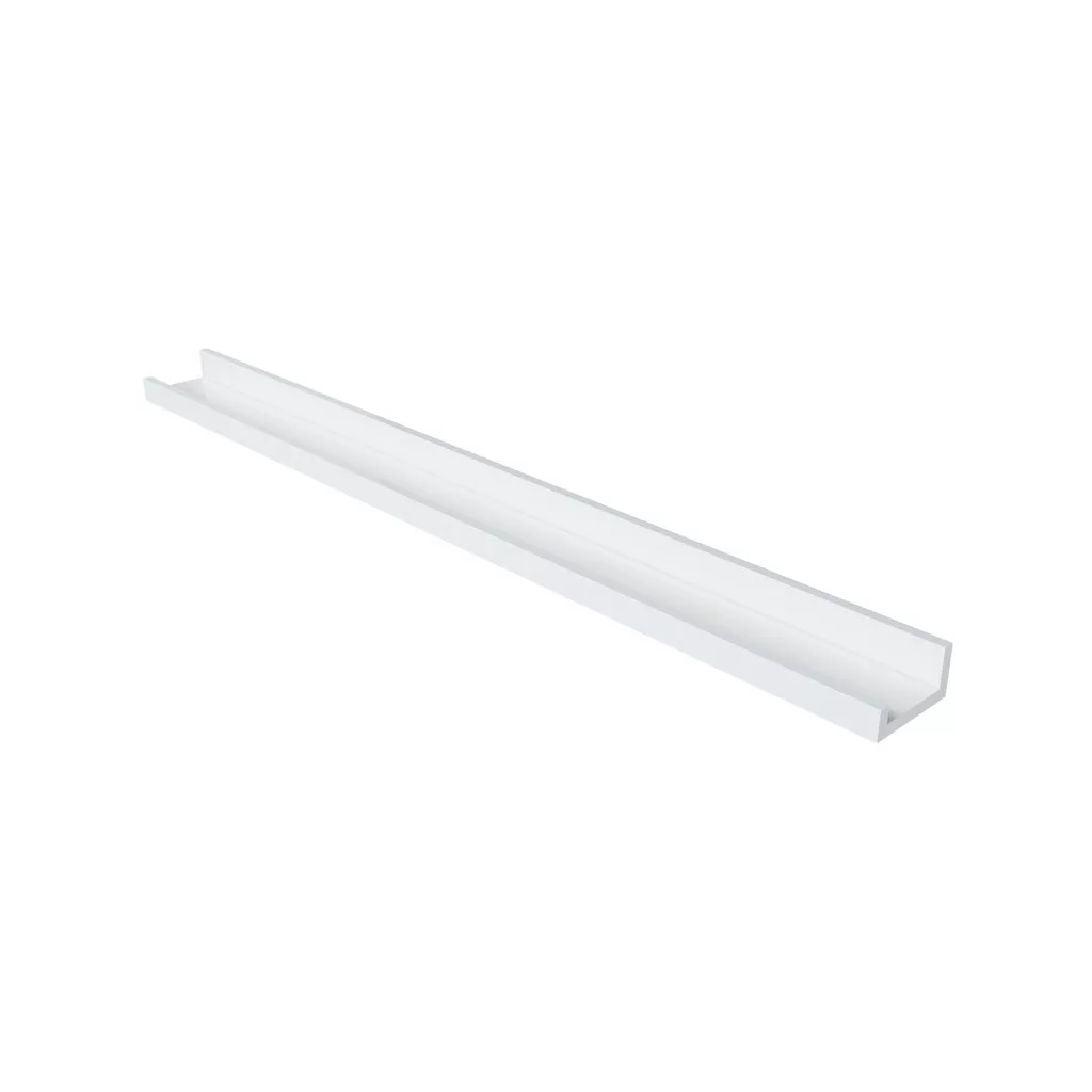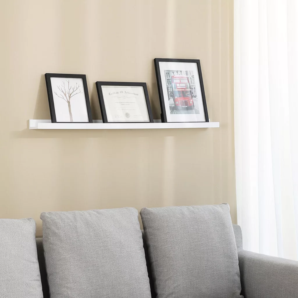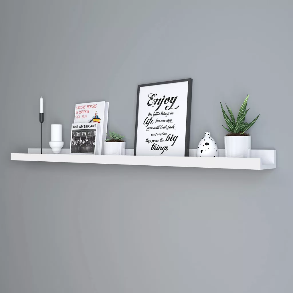 Stílusos lebegő fali polc képkeretek és könyvek tárolására, amely 110 cm hosszúságával és magasfényű fehér felületével modern eleganciát kölcsönöz otthonának.