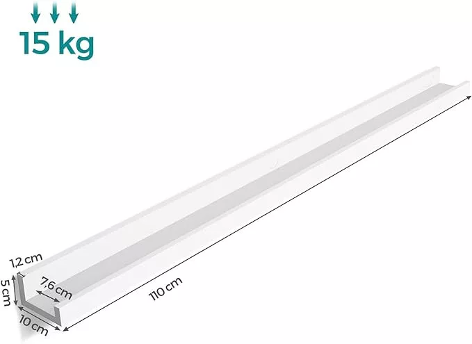 A SONGMICS lebegő fali polc tökéletes megoldás azok számára, akik praktikus és esztétikus tárolási lehetőséget keresnek otthonukba. A 110 cm hosszú polc speciális kialakítású élével biztosítja, hogy képkeretei, könyvei és dekorációs tárgyai stabilan álljanak anélkül, hogy lecsúsznának. A minőségi MDF anyagból készült polc tartós és kopásálló, akár 10 kg terhelést is elbír, így hosszú távon megbízható tárolási megoldást nyújt.