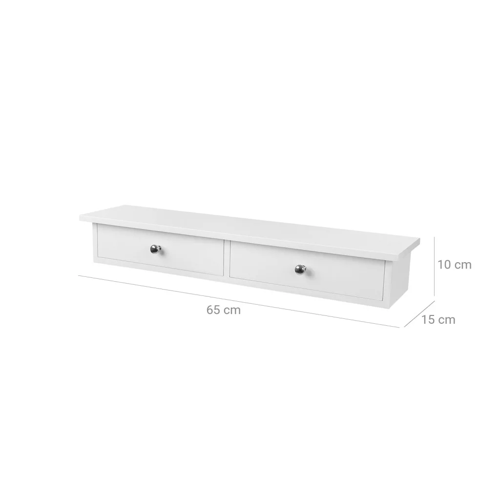 A minőségi MDF anyagból készült polc biztonságosan rögzíthető a falra, és akár 15 kg súlyt is elbír. A fiókok ütközővel vannak ellátva a biztonságos használat érdekében, így tökéletes választás kulcsok, dokumentumok vagy egyéb kisebb tárgyak tárolására.