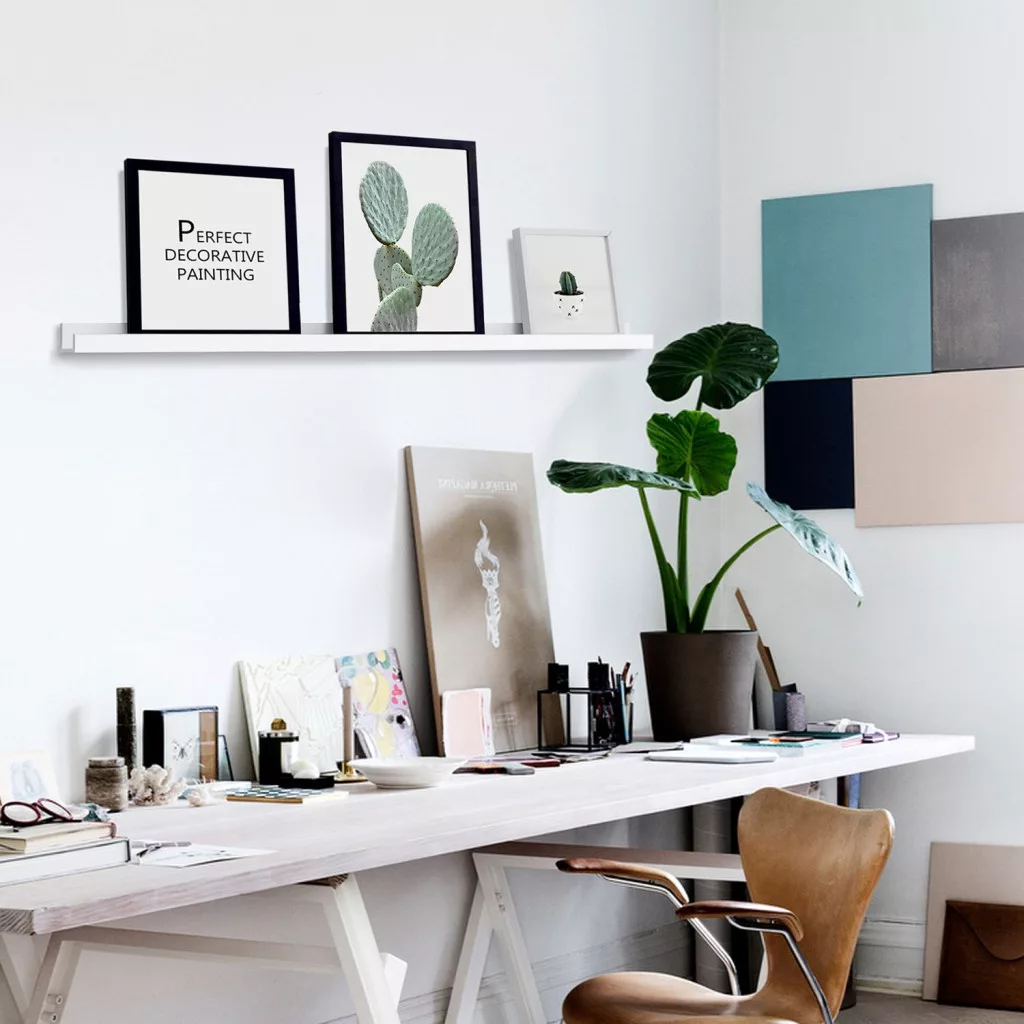 Elegáns, modern megjelenésű lebegő fali polc képkeretek és könyvek tárolására, 10 kg teherbírással és magasfényű fehér felülettel.