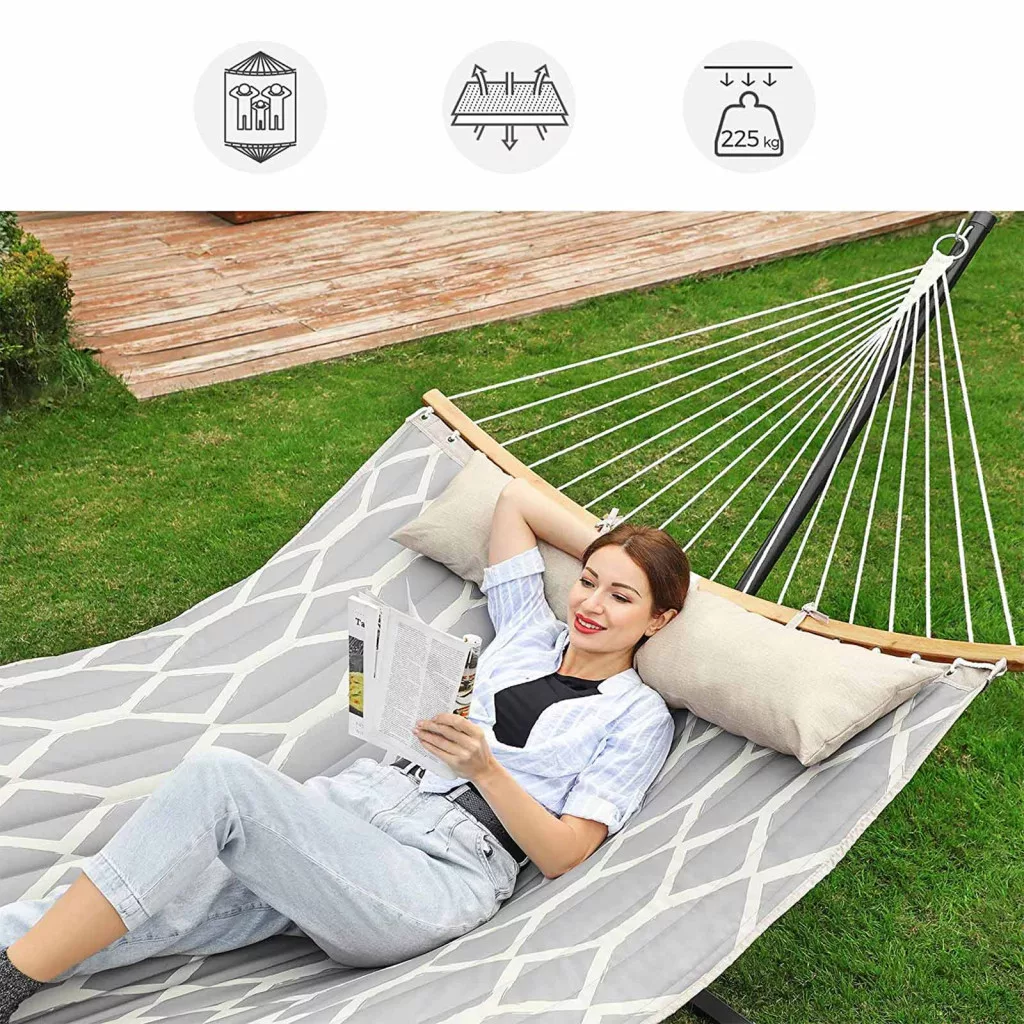 Extra széles, strapabíró függőágy puha párnázással és levehető bambusz tartórudakkal, tökéletes pihenéshez a kertben vagy teraszon.