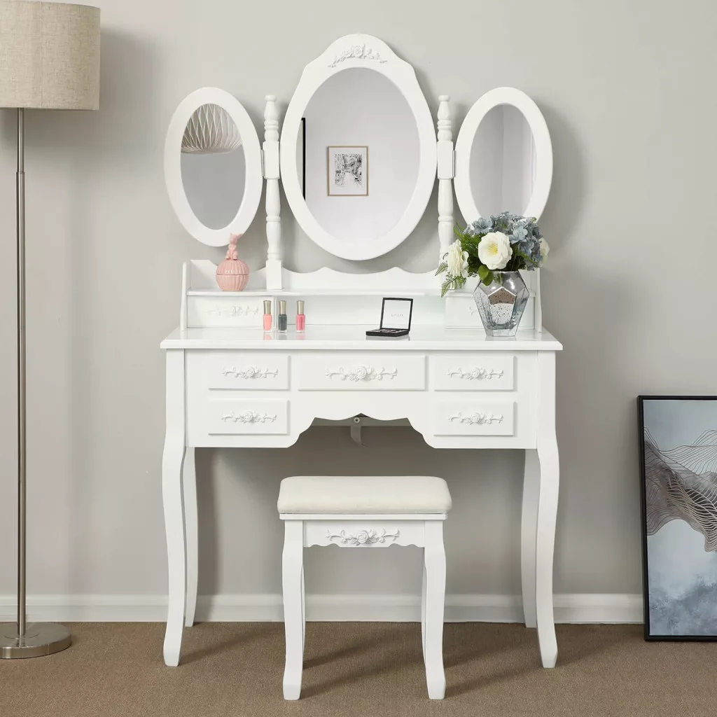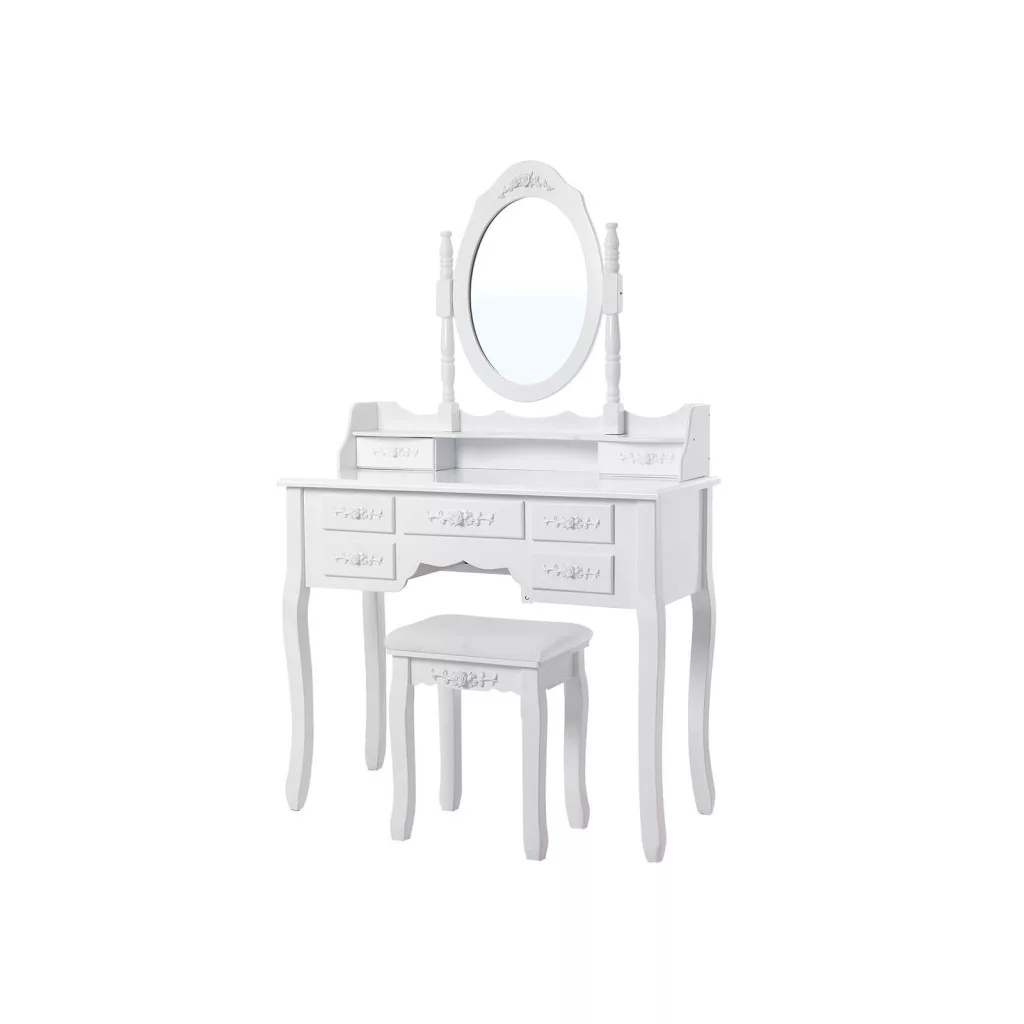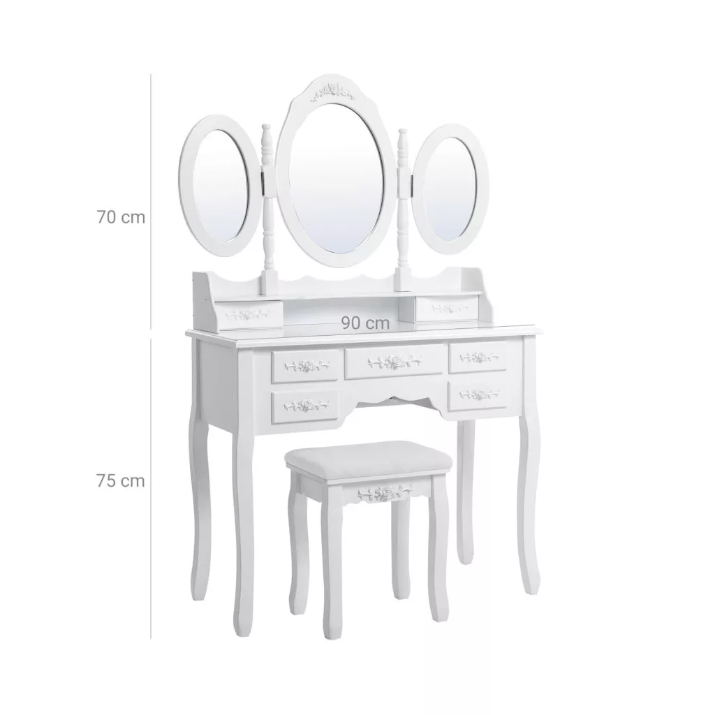 Ez a gyönyörű, fehér fésülködőasztal egyesíti a klasszikus dizájnt a modern funkcionalitással. A három tükör tökéletes rálátást biztosít minden szögből, míg a 7 fiók bőséges tárolóhelyet kínál kozmetikumok és szépségápolási termékek számára. A faragott díszítések és az ívelt lábak elegáns vintage hangulatot teremtenek.