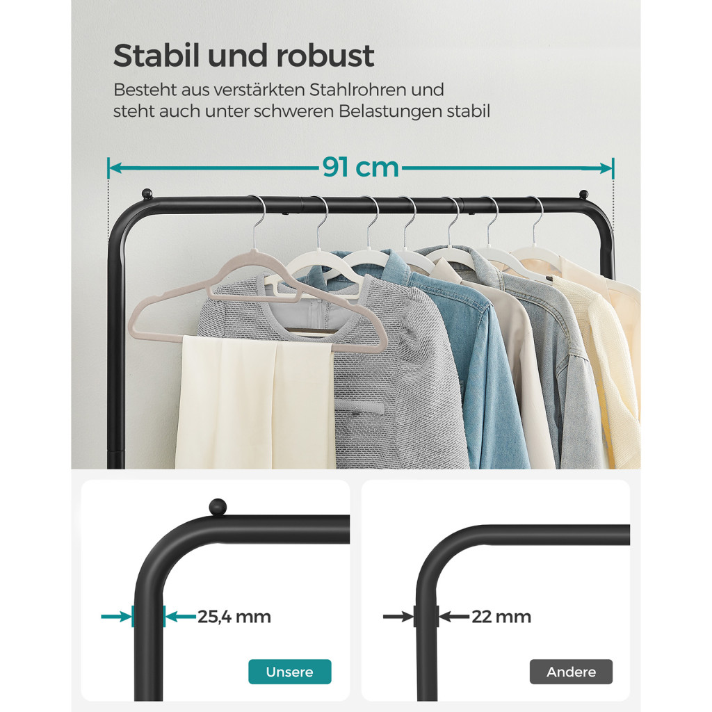 A négy görgővel ellátott állvány könnyen mozgatható, két kerék rögzíthető a stabil állás érdekében. A végzárókkal ellátott ruharúd megakadályozza a vállfák lecsúszását, így ruhái biztonságban vannak.