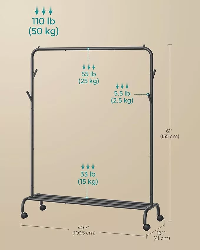 Strapabíró, sokoldalú ruhaállvány 50 kg teherbírással, görgőkkel és alsó polccal a maximális tárolási rugalmasságért.