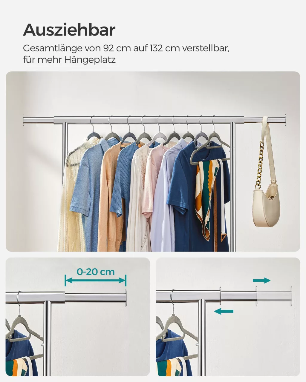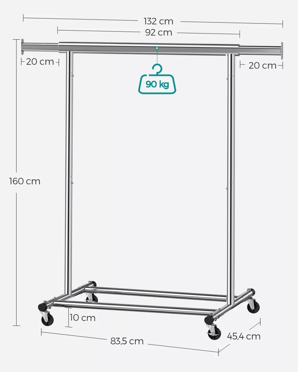 Ez a prémium minőségű SONGMICS ruhaállvány 1 mm vastag acélcsöveivel és megerősített szerkezetével kiemelkedő, 90 kg-os teherbírást biztosít. A kihúzható felső rúd 92 cm-ről 132 cm-re bővíthető, így extra tárolóhelyet kínál ruhái számára.