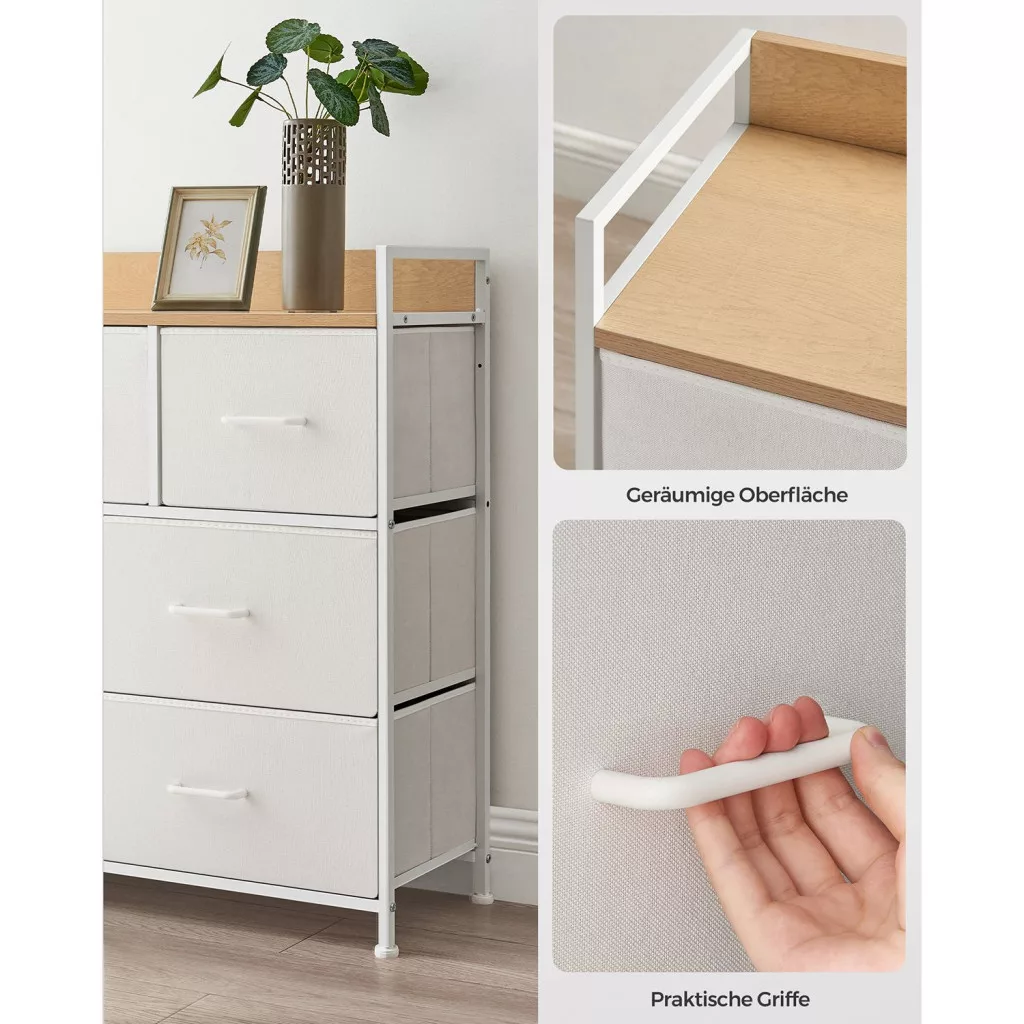 A fehér textil fiókok és a természetes fa felület kombinációja időtlen eleganciát kölcsönöz a bútornak, míg a praktikus fogantyúk és az állítható lábak a mindennapi használatot könnyítik meg. A szekrény teteje dekorációs felületként is szolgál, tovább növelve a bútor sokoldalúságát.