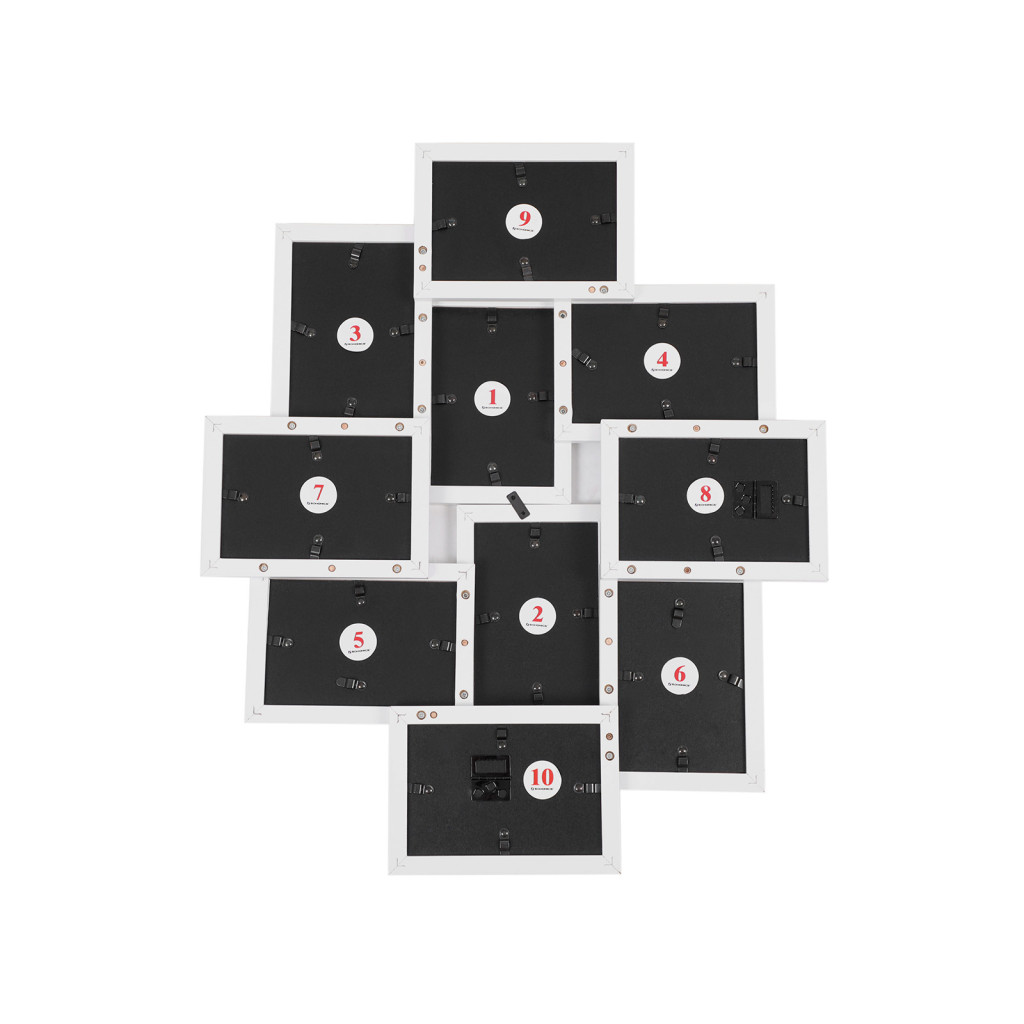 Elegáns, fehér MDF képkeret kollázs, amely 10 db 10x15 cm-es kedvenc fotójának biztosít stílusos megjelenítési lehetőséget a falon.